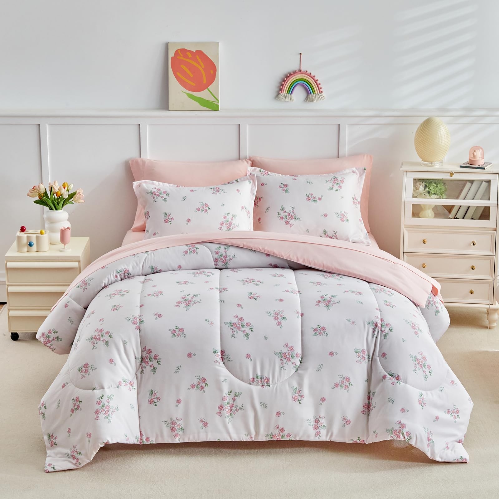 6pcs Bed in a Bag for Girls, Floral Pink Design, Twin Size Microfiber Comfort...