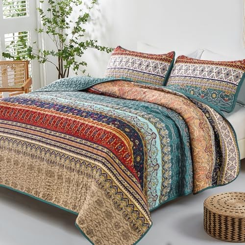 Boho Quilt Set, Green and Brown Bohemian Quilt Bedding Set, Queen Brown Green