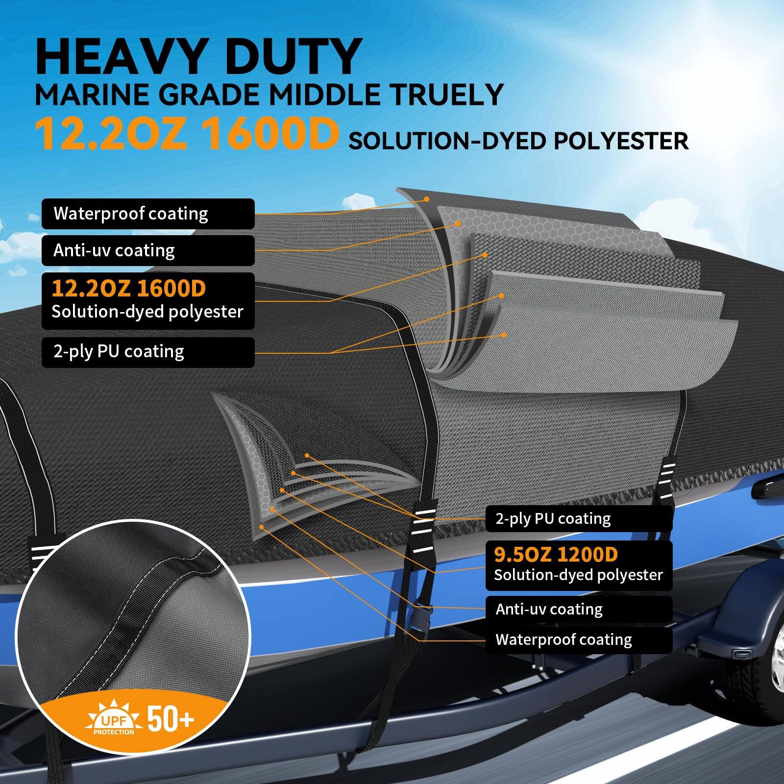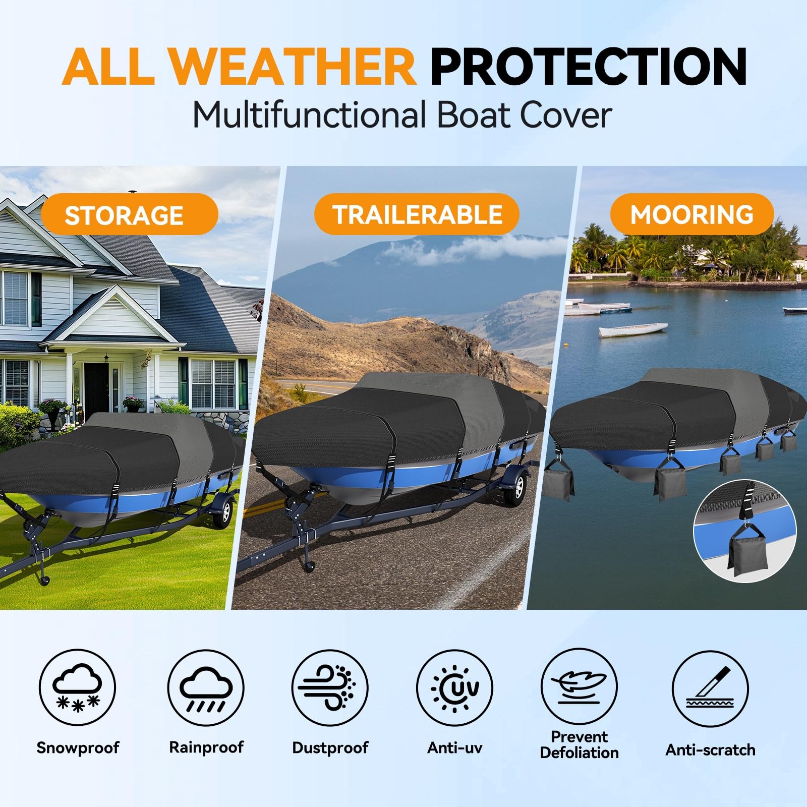 14-16ft Tri-Hull V-Hull Boat Cover 1600D 1200D w/ 2 Loops Trailering Mooring