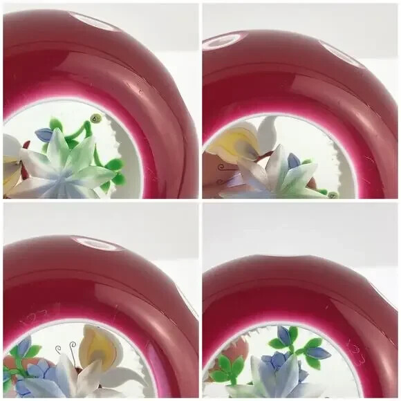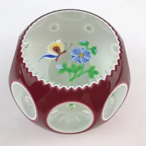 Perthshire 1990E Double Overlay Lampwork Butterfly Flower Faceted Paperweight