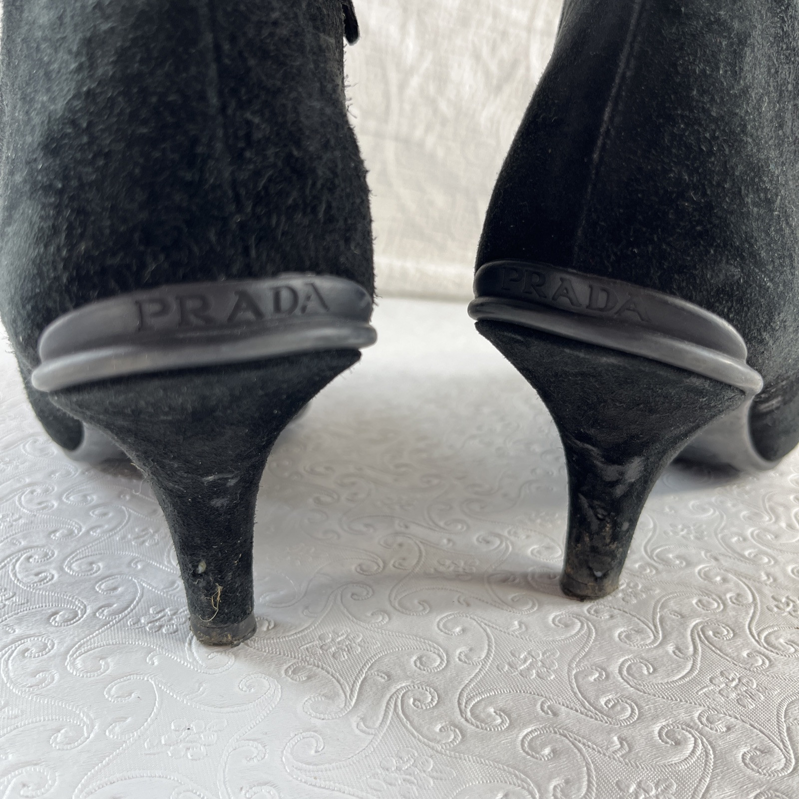 Prada Italian Black Suede Booties Kitten Heels Ankle Boots Women 40 Zip Up Fair