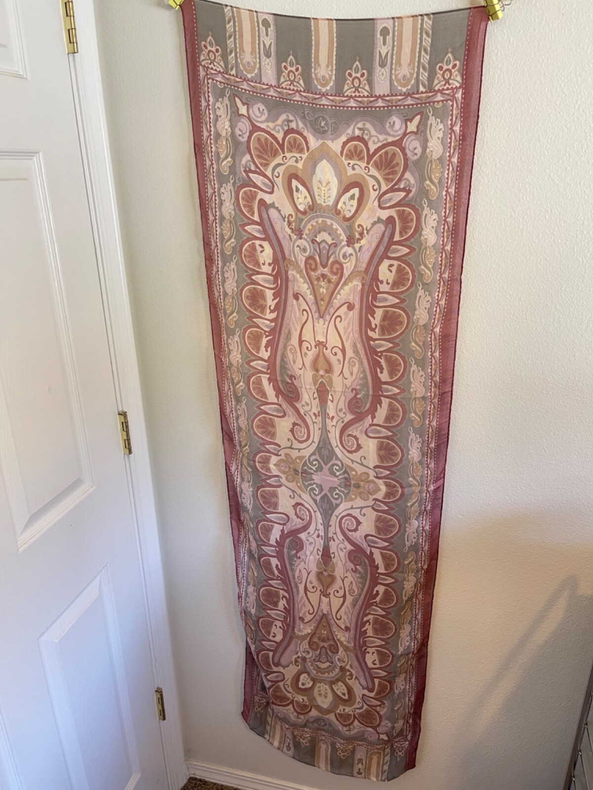 как выглядит 100 Mulberry Silk Scarf 12"x68" Purples and Sage Green Mandela Design фото