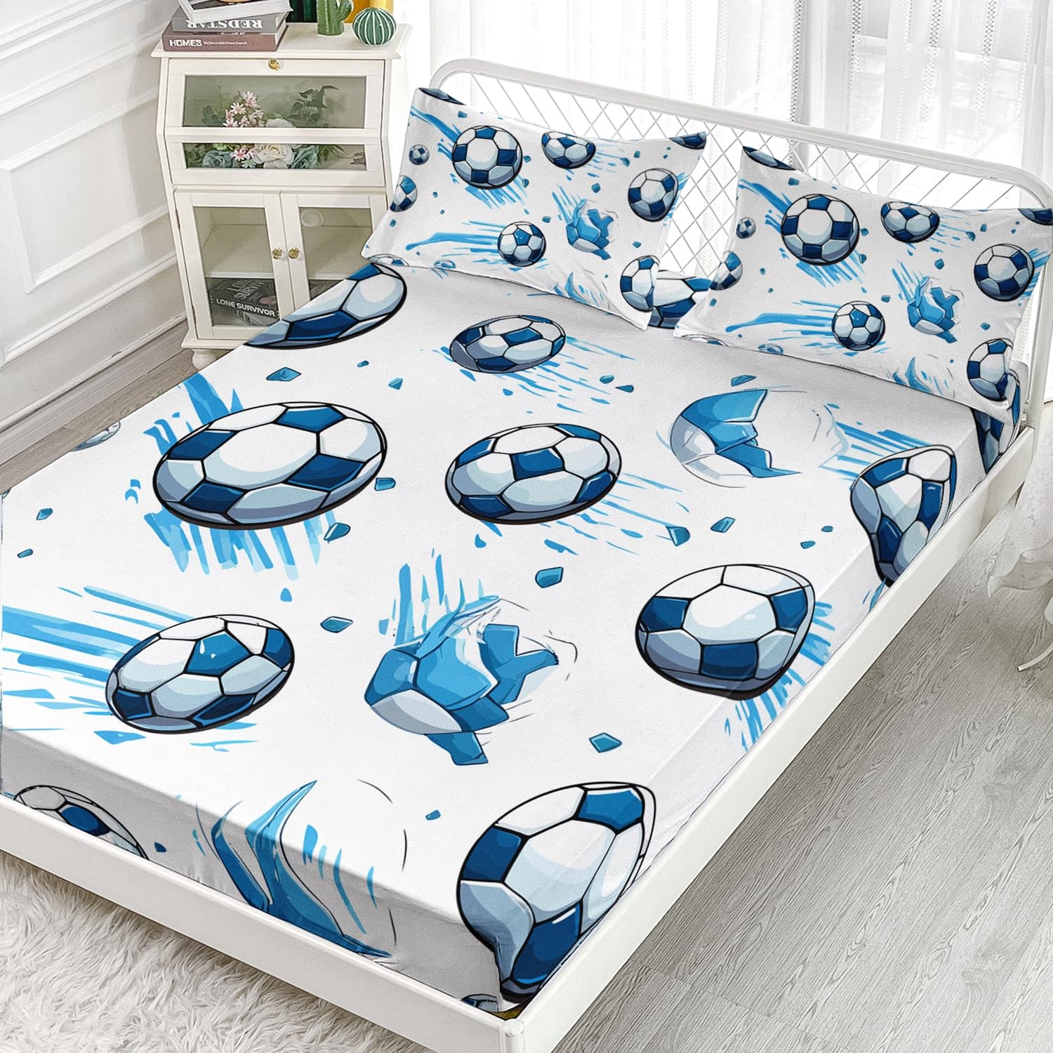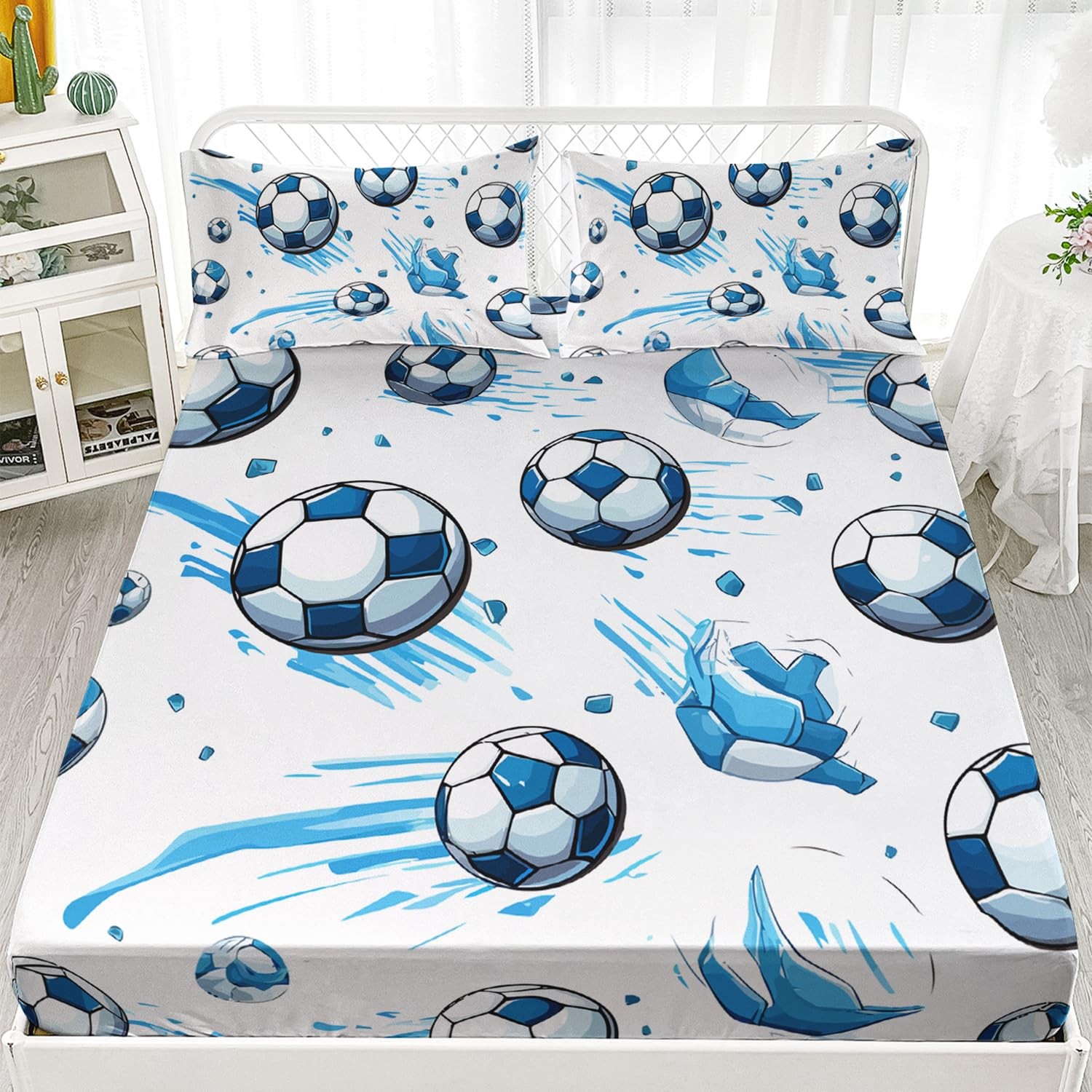 Soccer Full Size Fitted Sheet Set, Sport Football Bed Sheet, Blue Graffiti Be...
