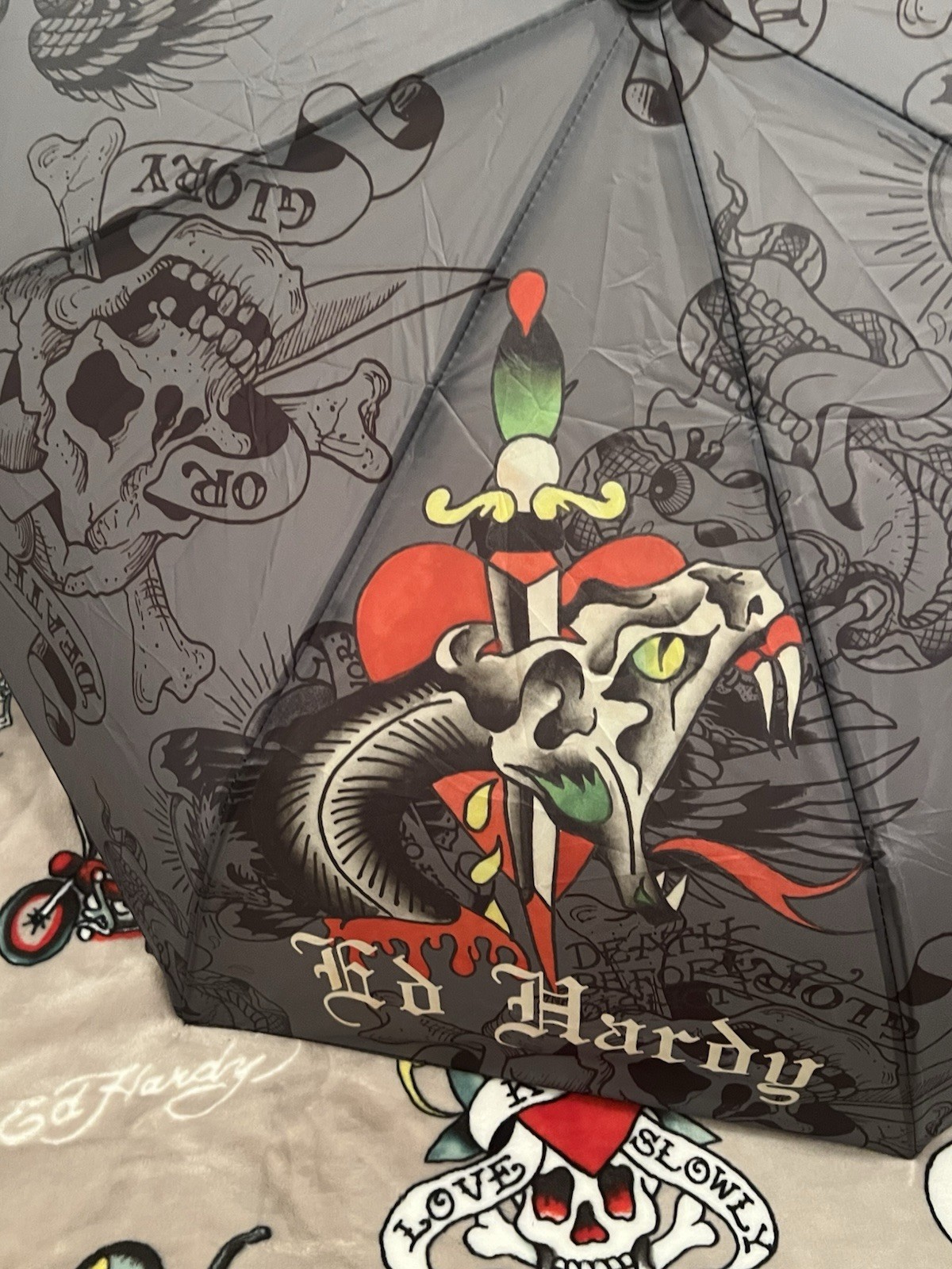 как выглядит Ed Hardy Grey Auto Umbrella Snake Dagger Death Before Dishonor Rare NWT фото