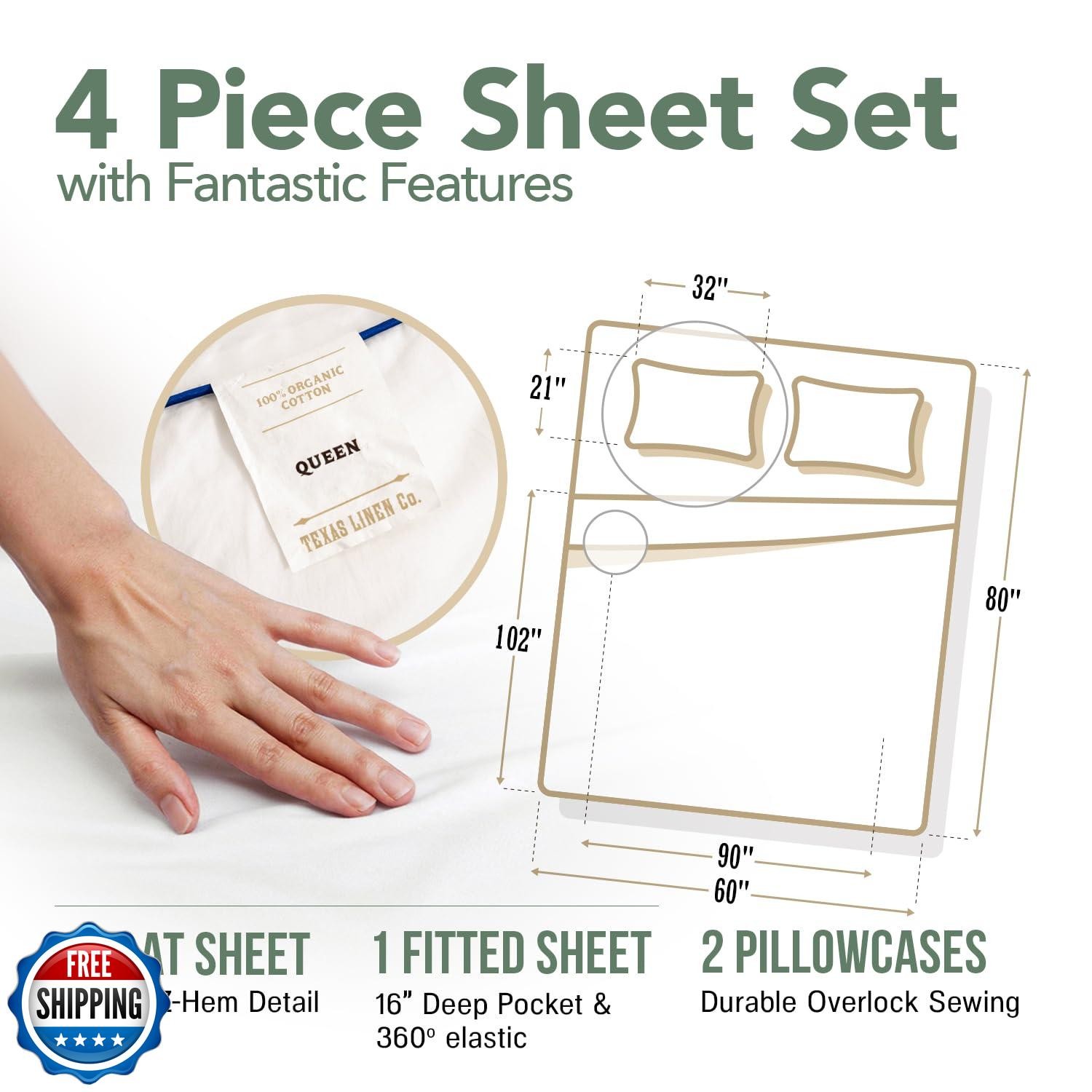 TEXAS LINEN CO. 100 Organic Cotton Sheets Twin XL Size - 3 PC Or