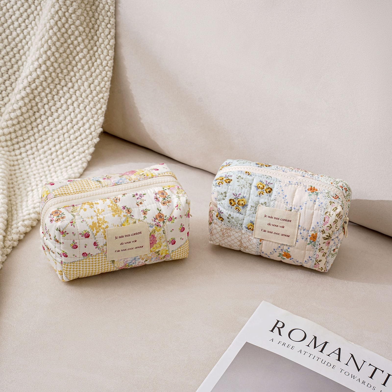 uekeboag 2Pcs Cute Quilted Cotton Makeup Bag, Coquette Quilted Aesthetic Cosm...