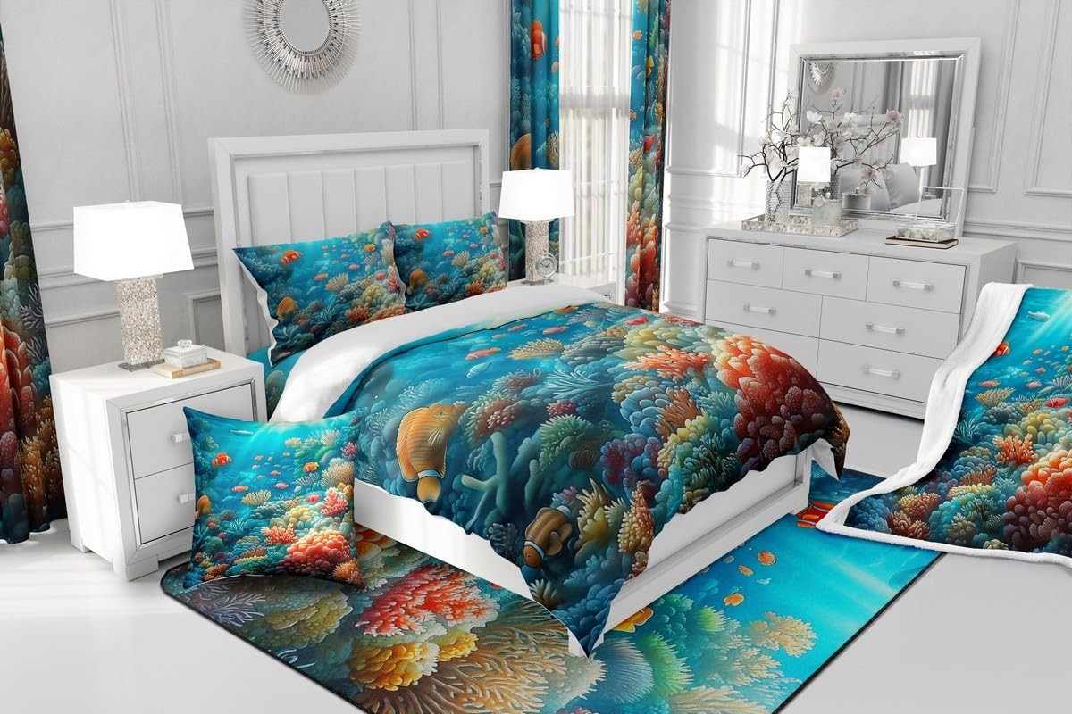 Colorful Coral Bedding Set Full Size,Fish Underwater World Comforter Set for ...