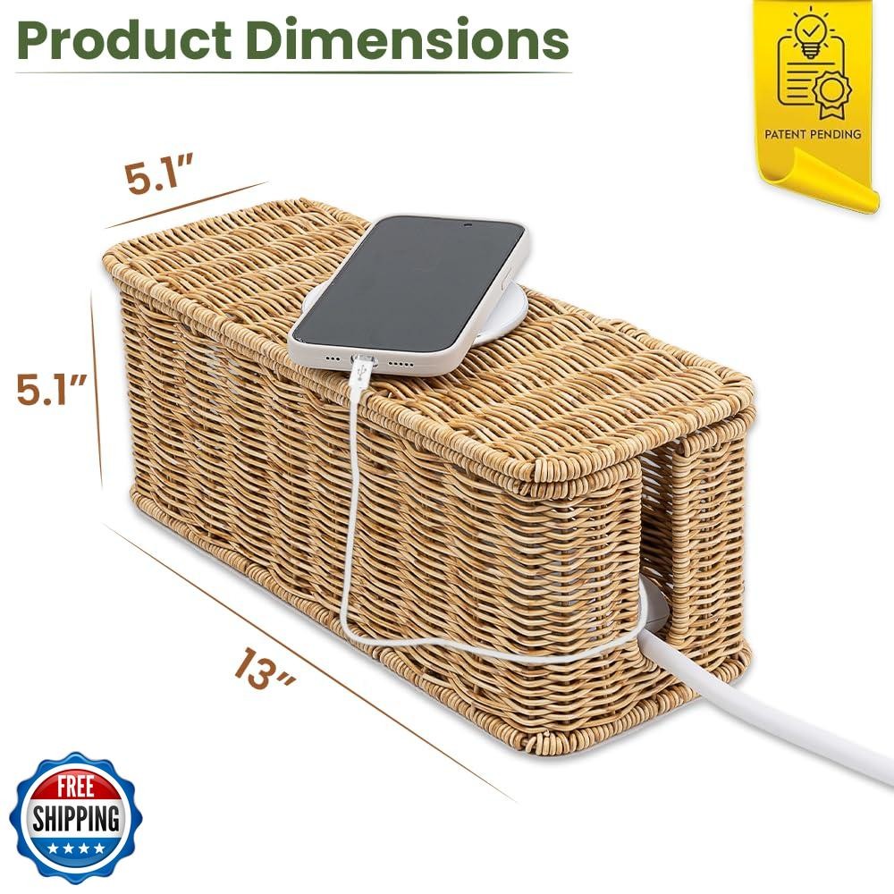 Cable Management Box, Handmade Rattan Cable Organizer, 2 Open Slo