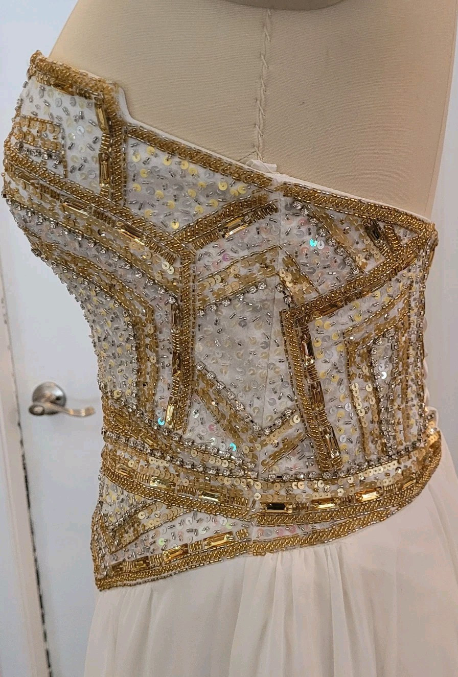 как выглядит Architectural Maxi Gown 6/8 Ivory Gold Strapless Lace Up Prom Special Event фото