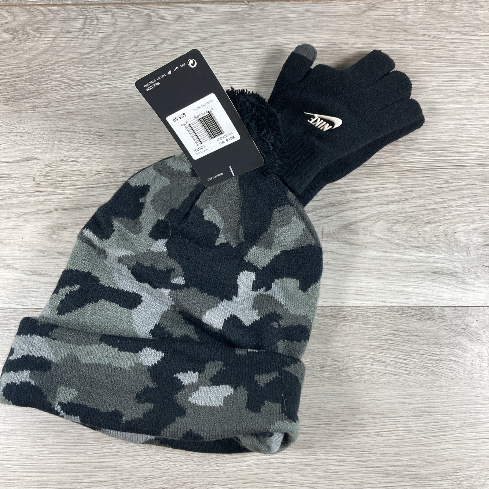 Nike Big Boys Futura Grey Camo Beanie and Gloves Set Black Youth Sz 8/20 New