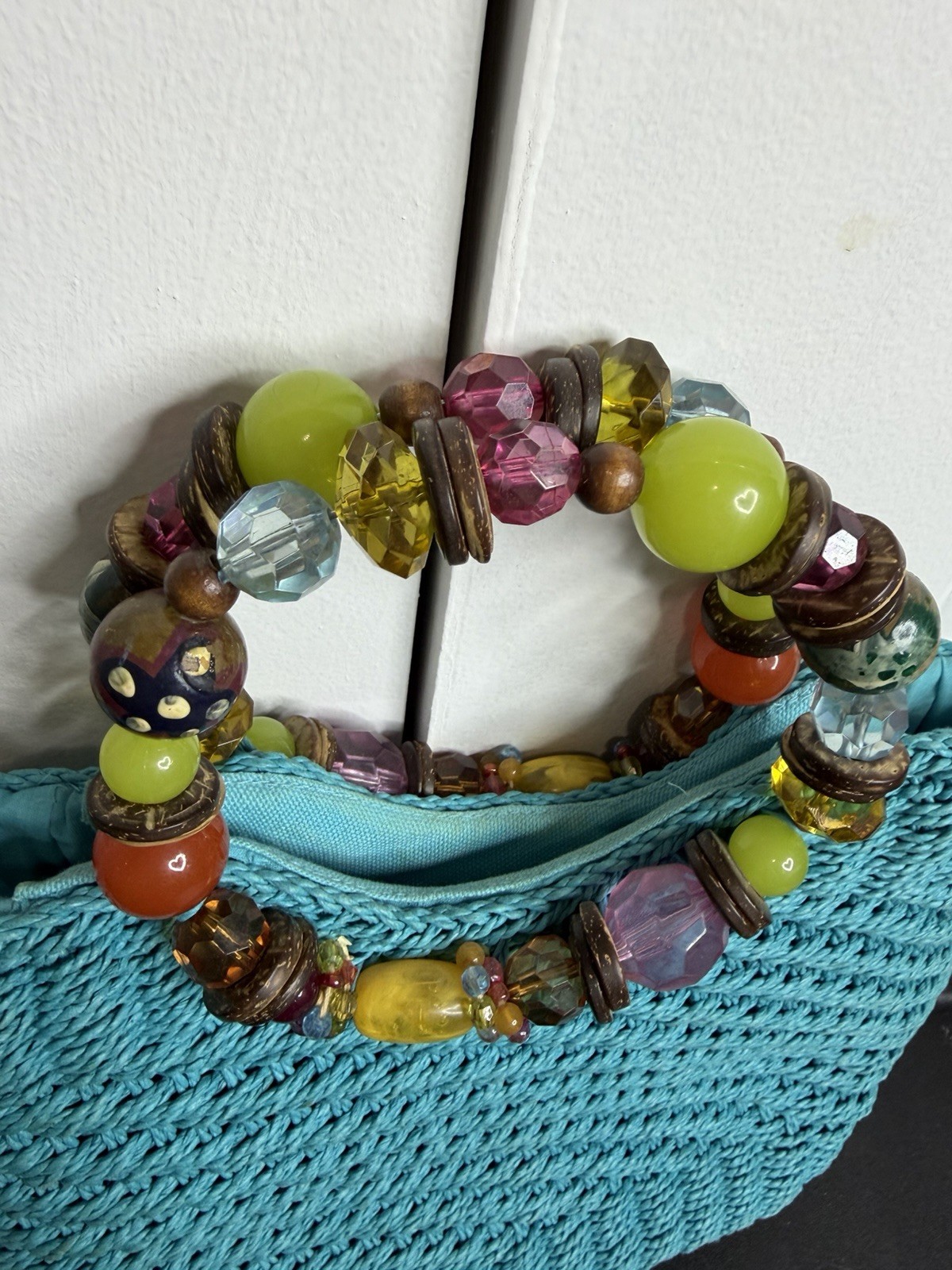 как выглядит Vintage Cappelli Straworld, Inc. woven straw bag purse turquoise- jewel handles фото