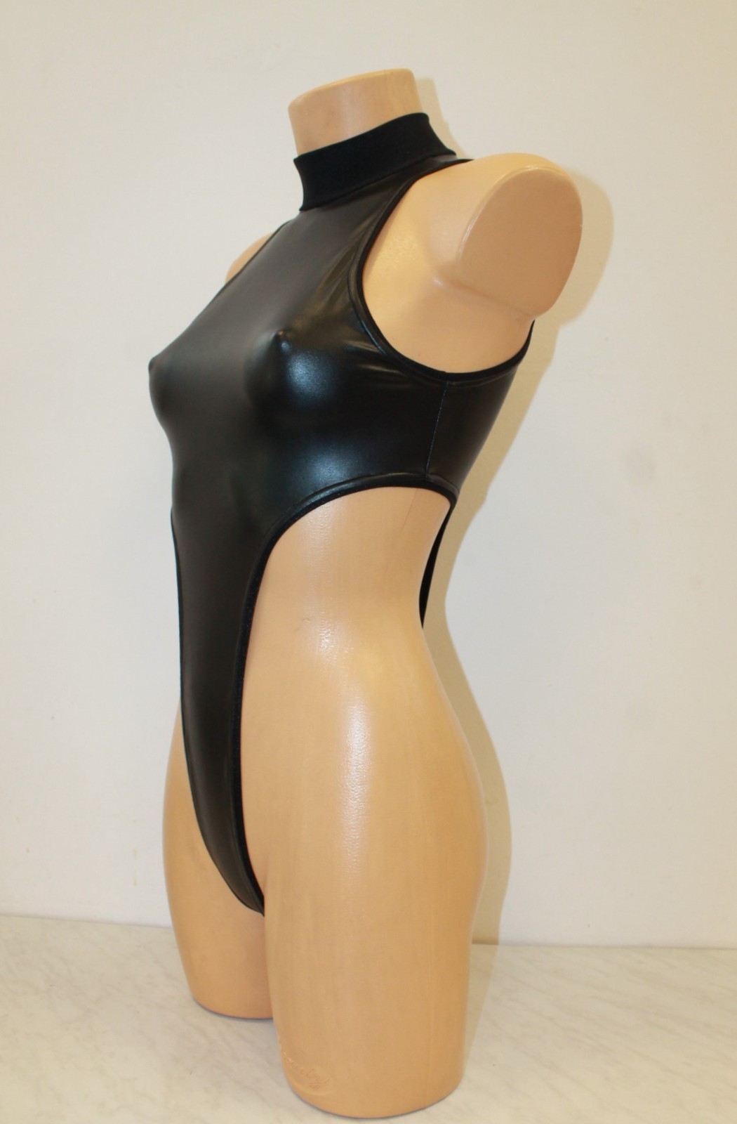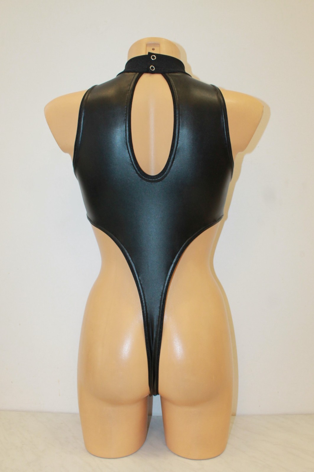 Women Thong Leotard 204-10 HighCollar Open Thig Black Spandex Leatherlike Size L