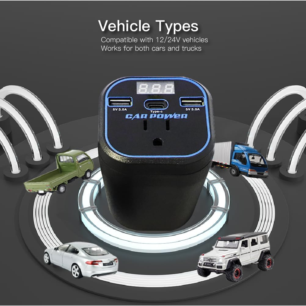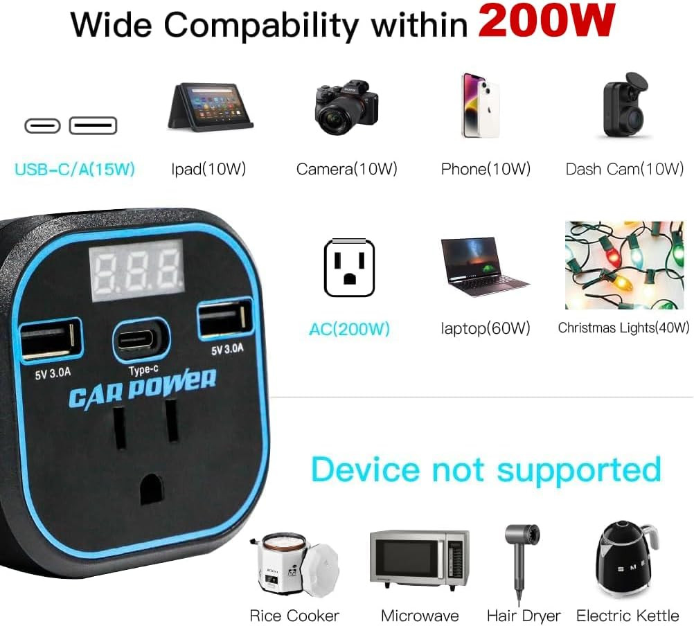 200W Car Power Inverter, 12V to 110V, Car Adapter with Dual USB and Type-C for L