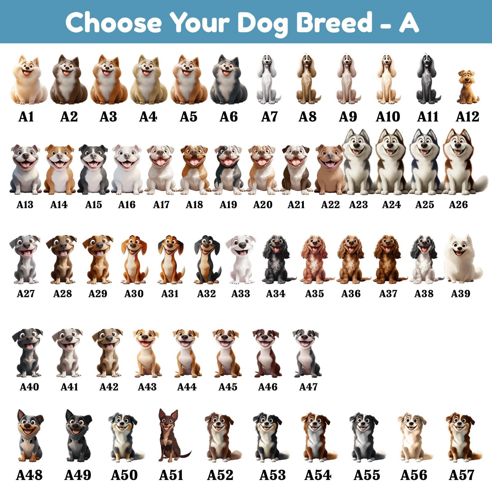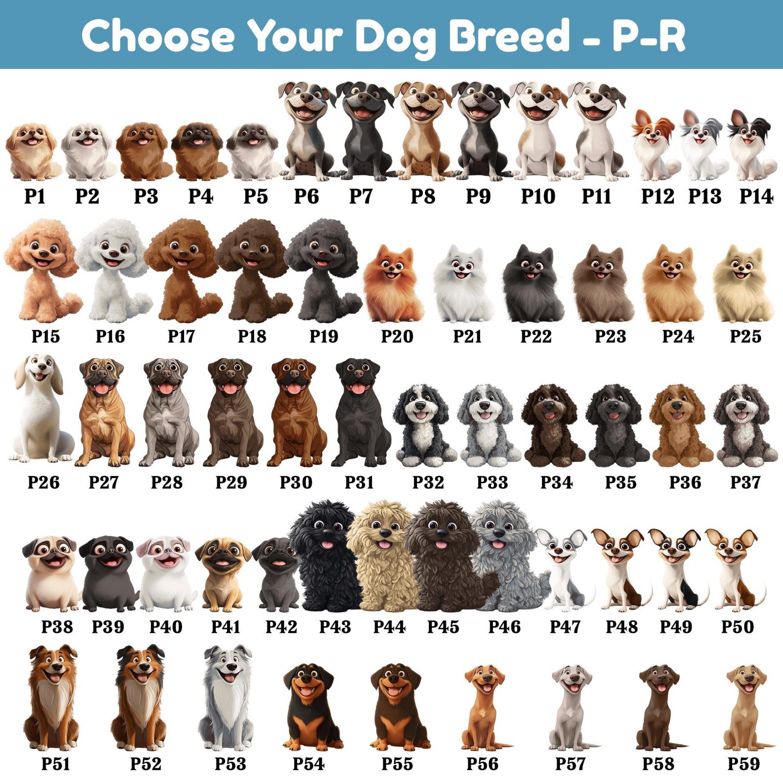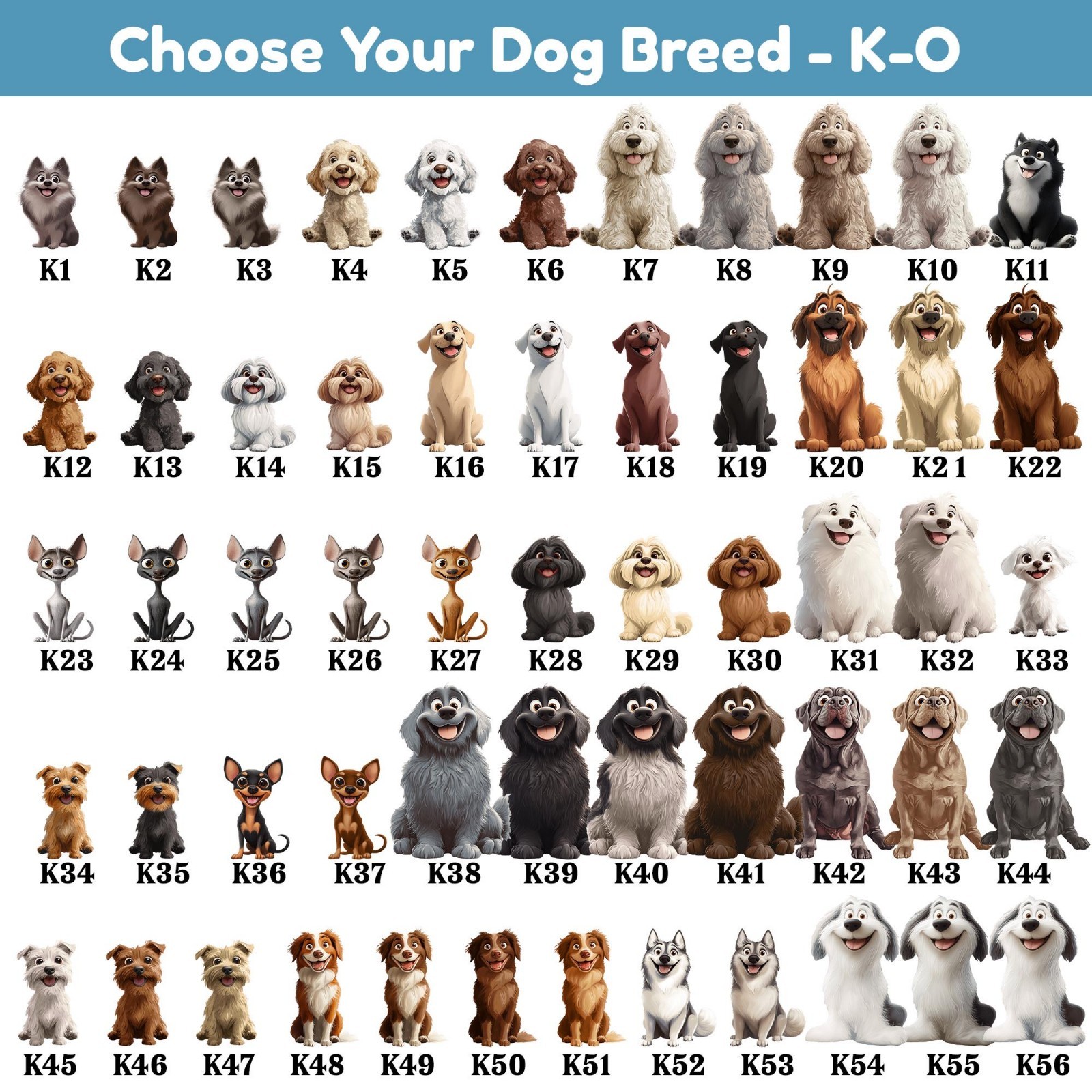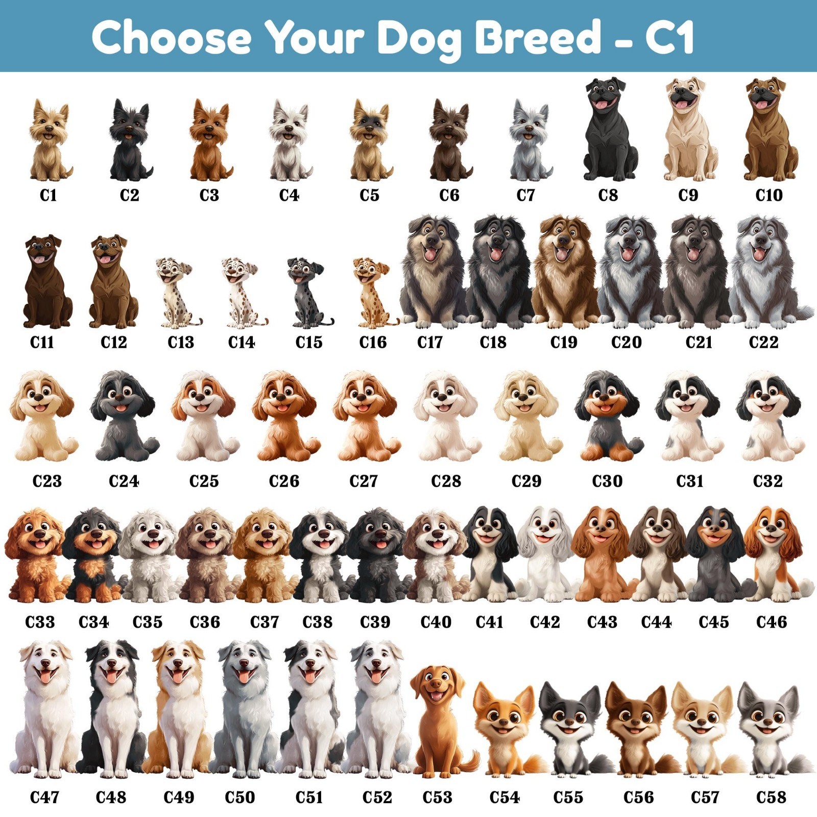 Personalization Instructions: For Girl: Choose skin tone, outfit, eye color, hair color & hairstyle, and name. For Dogs: you can add 1 to 3 dogs. For each, enter breed code + dog’s name. Example: Girl: S1, O1, E3, Black (H1), Sop