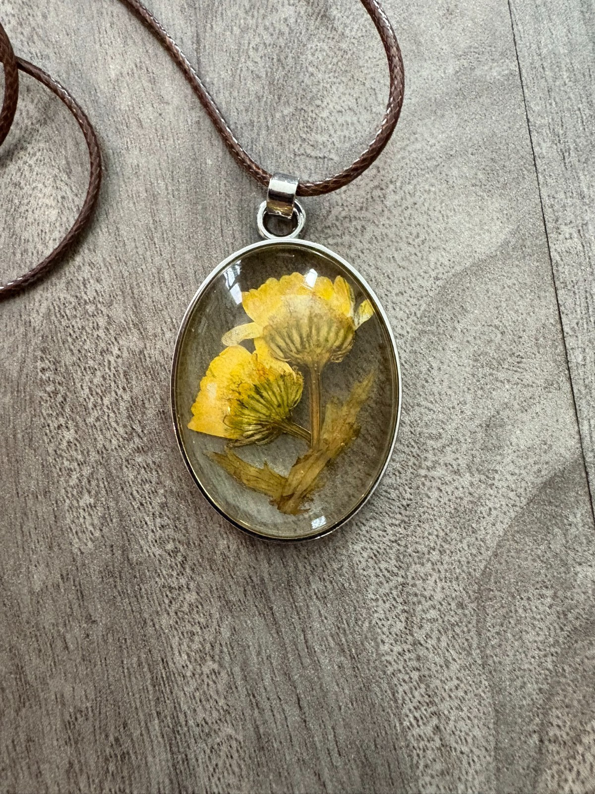 Handmade Oval Resin Dried Flower Pendant Necklace Pressed Yellow on Brown Cord