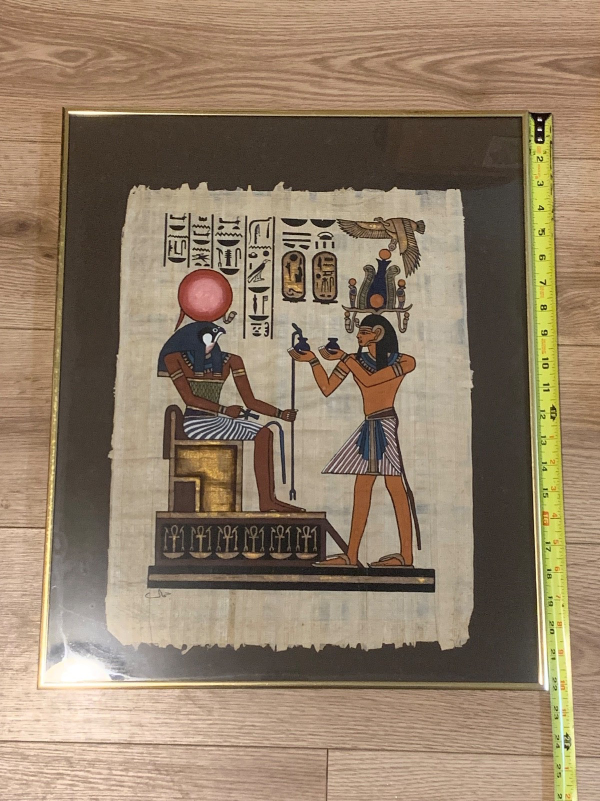 • Hand-Painted Egyptian Papyrus Art Pharaonic Offering Scene Horus Ra