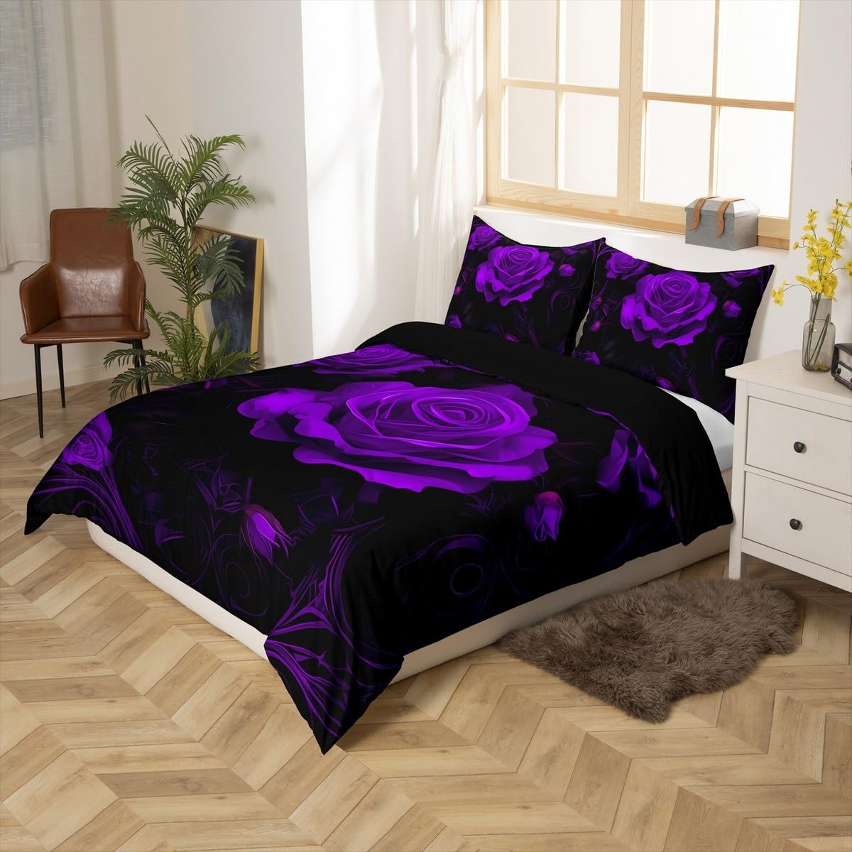 Valentine's Day Duvet Cover Romantic Roses Couple Comforter Cover Purple Blac...