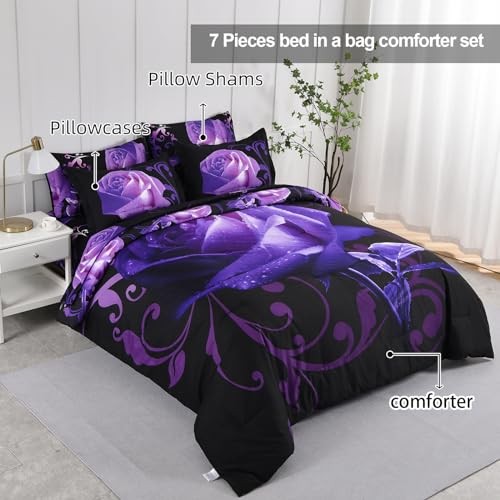 Floral Comforter Set Queen 7 Piece Bed in a Bag Rose Queen 90x 90 Purple