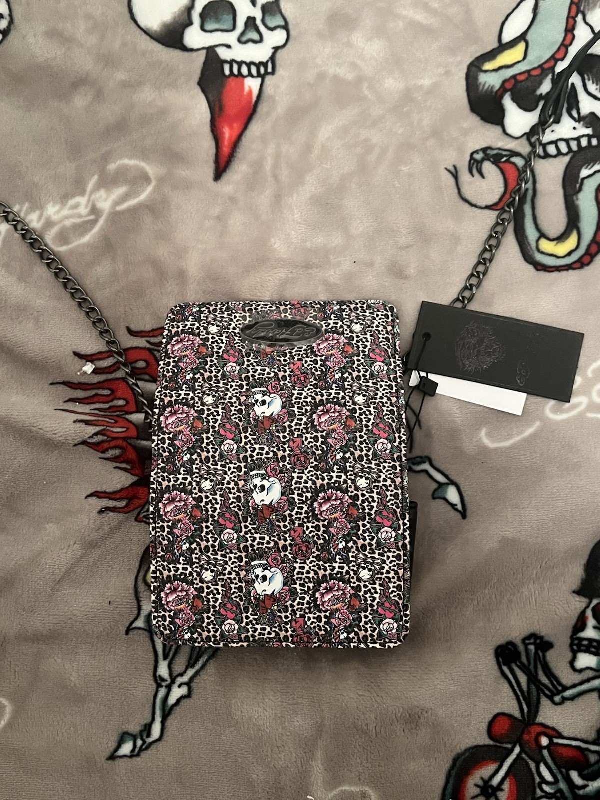 как выглядит Ed Hardy Wallet Cardholder Leopard Print Skull Flowers Chain Leather Strap фото
