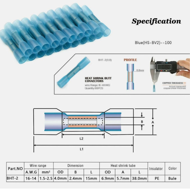 1000Pcs Heat Shrink Waterproof Wire Connectors Blue 14-16AWG Butt Seal Terminals