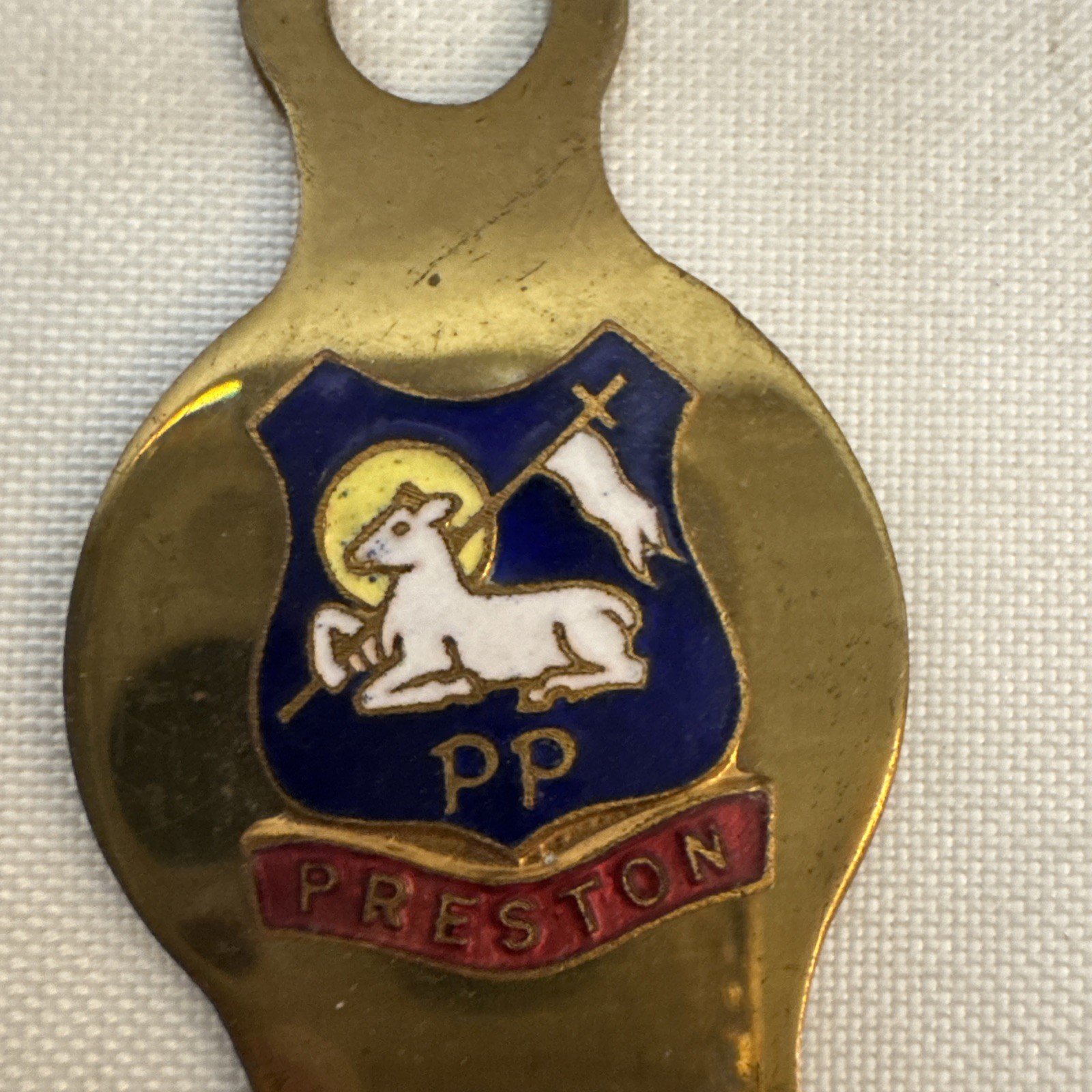 • Vtg 4 Brass Shoe Horn Preston Enameled England Coat Of Arms Used Condition