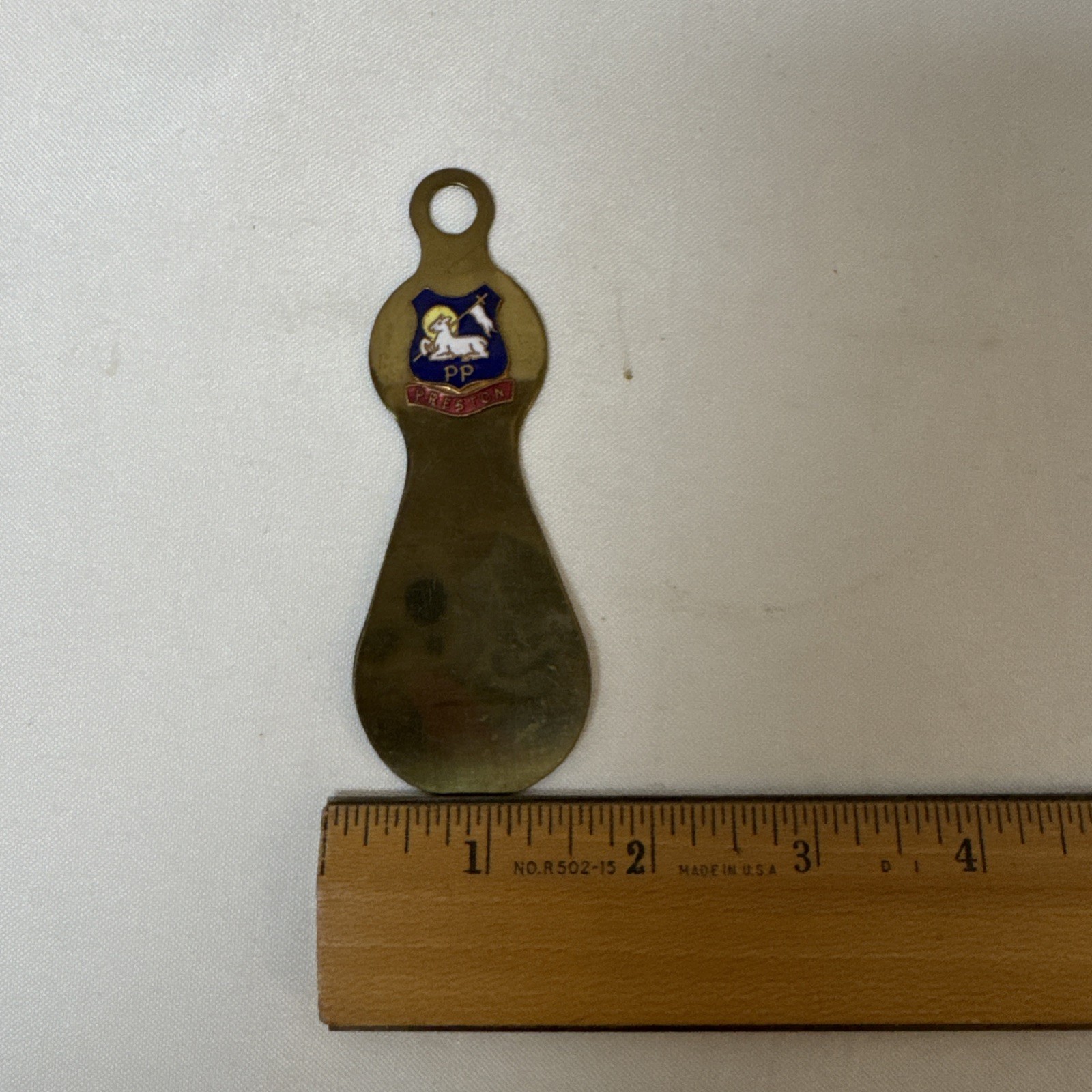 как выглядит Vtg 4 Brass Shoe Horn Preston Enameled England Coat Of Arms Used Condition фото