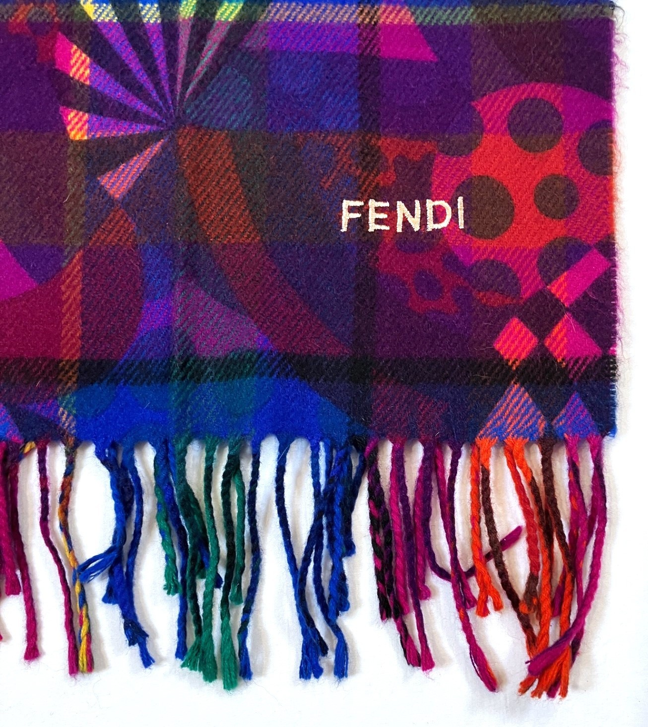 как выглядит Vintage Fendi Logo Winter Scarf Acrylic Fringe Colorful Abstract Italy 64 x 11.5 фото