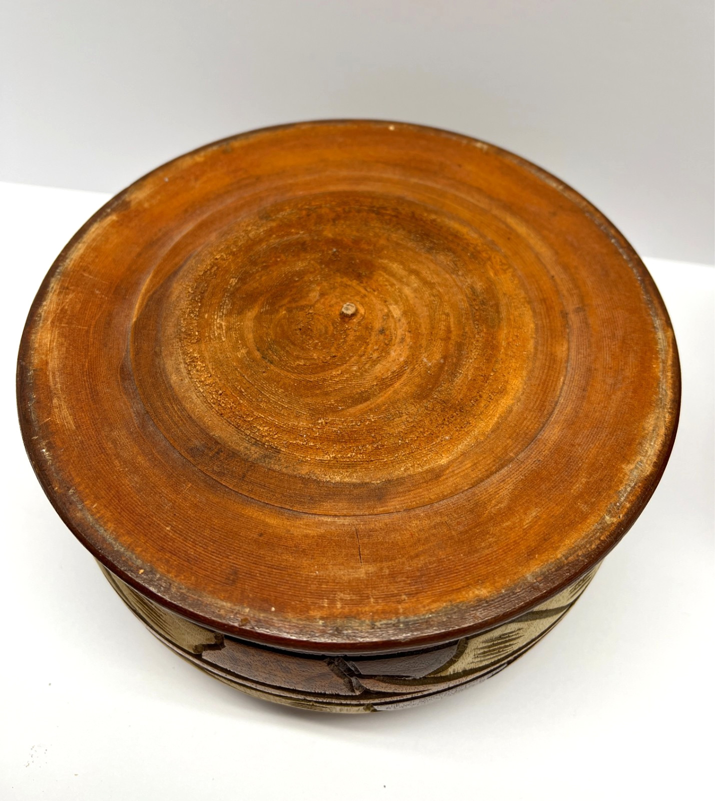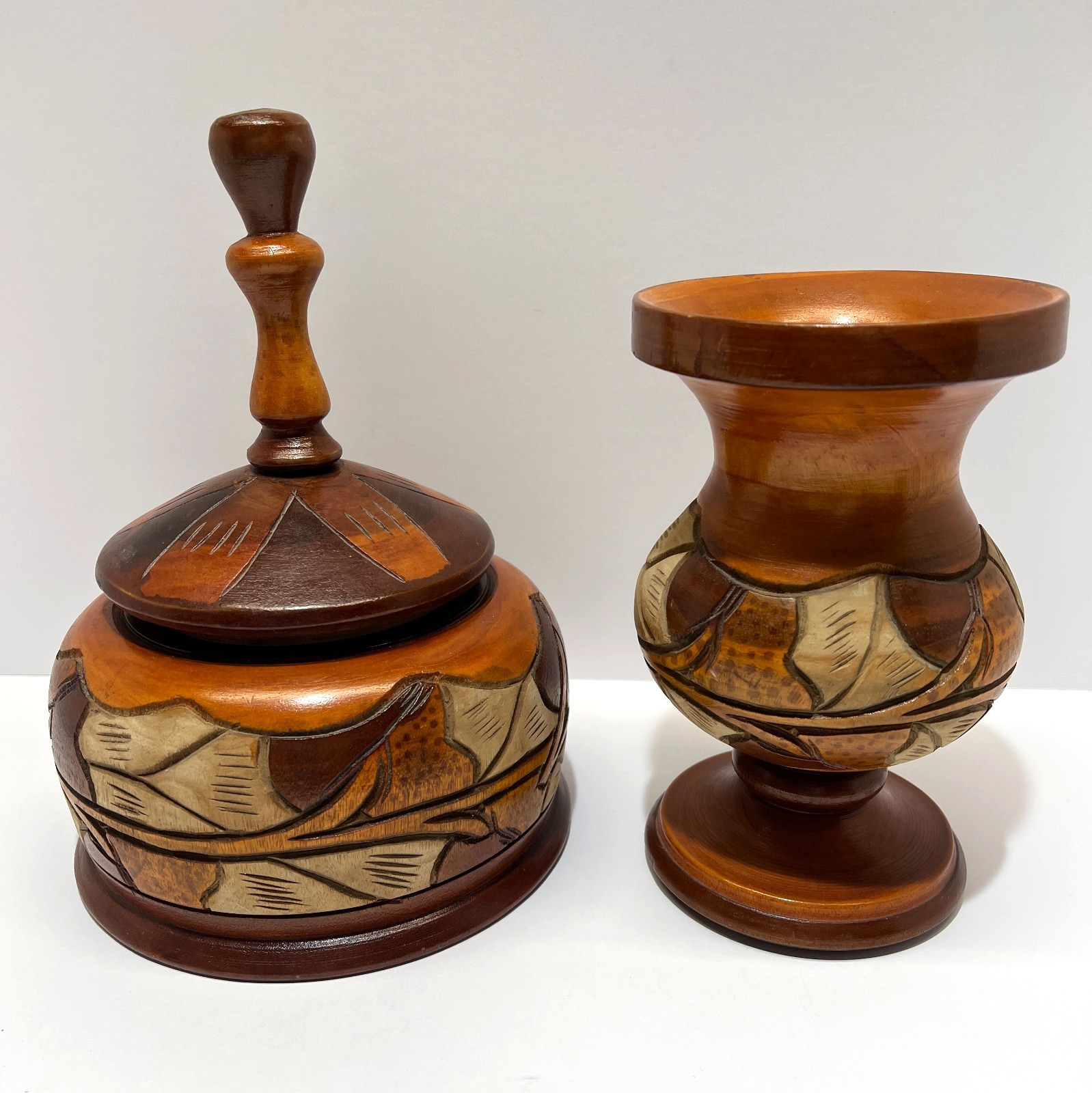 • Vintage Hand Carved Turned Solid Wood Pedestal Vase Bowl With Lid Set of 2