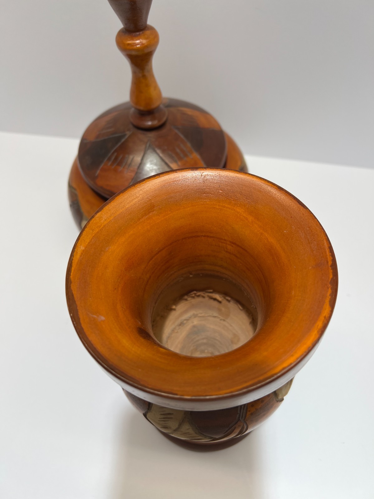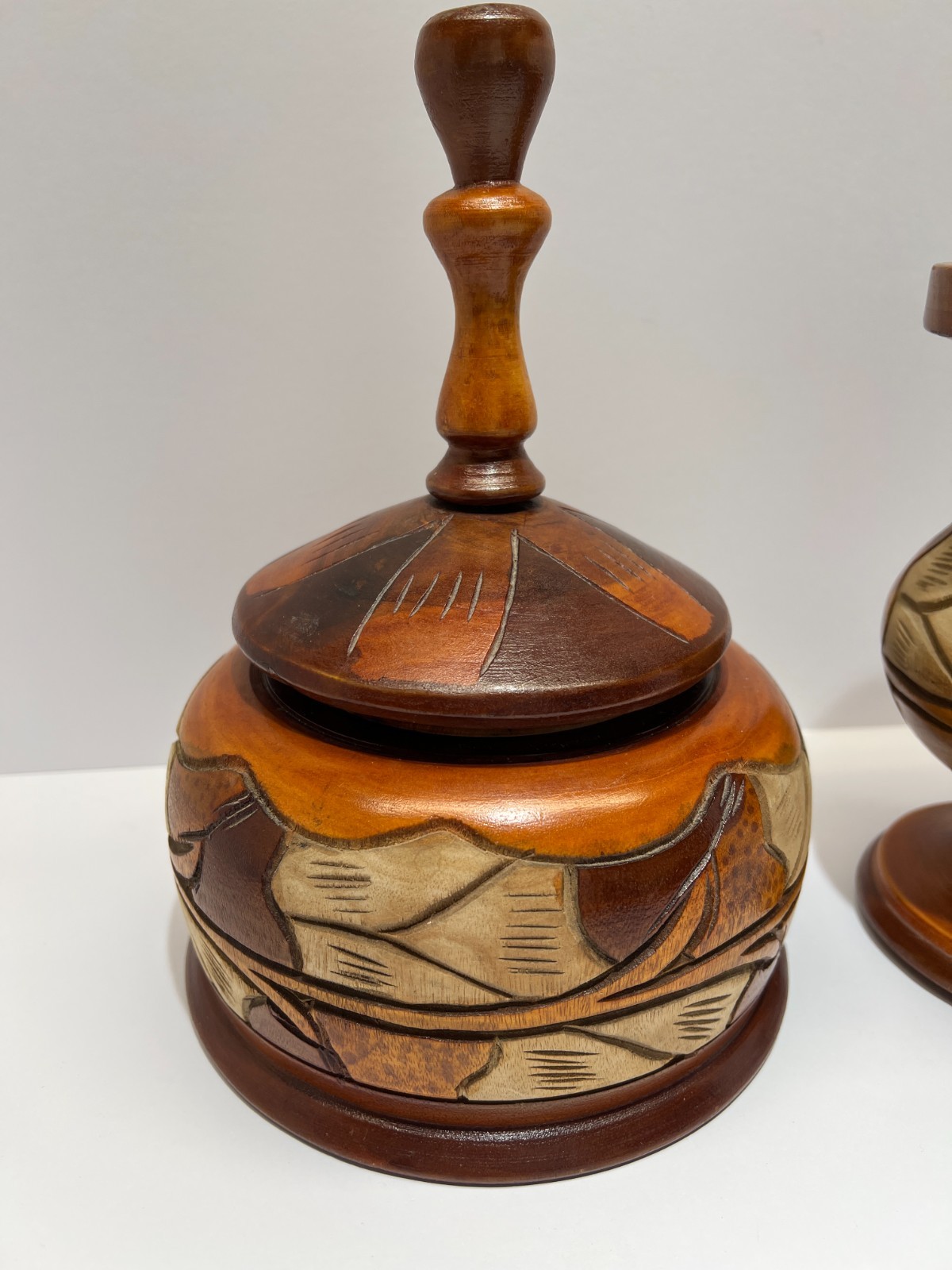 как выглядит Vintage Hand Carved Turned Solid Wood Pedestal Vase Bowl With Lid Set of 2 фото