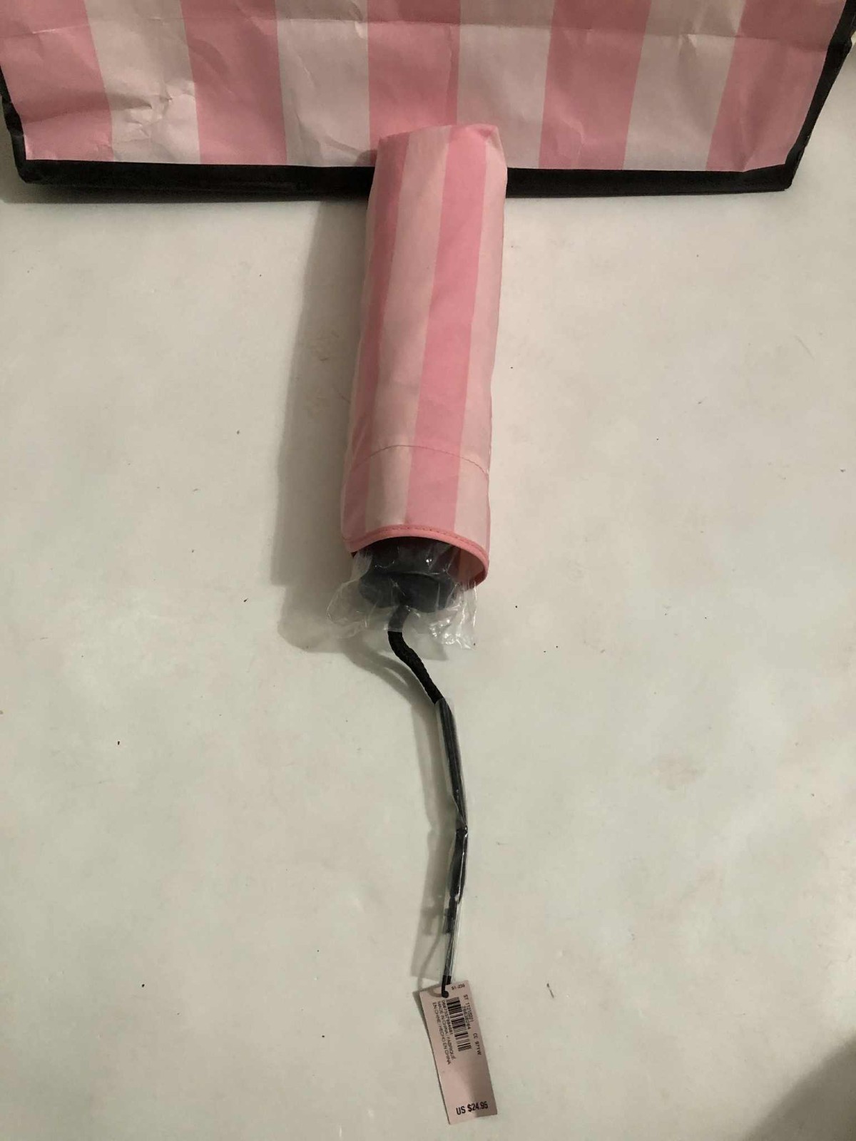 как выглядит Victorias Secret Iconic Stripe Rain Umbrella Logo Retractable Strap Pink/White фото