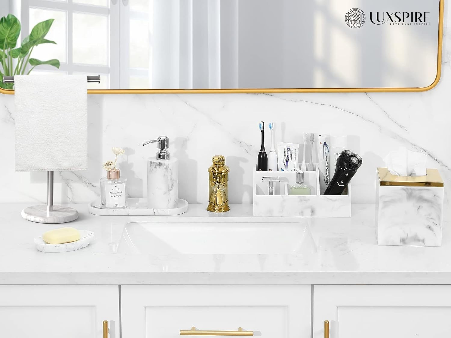 Bathroom Counter Organizer 5 Slot Toothbrush Holder Marble Resin Gravel White