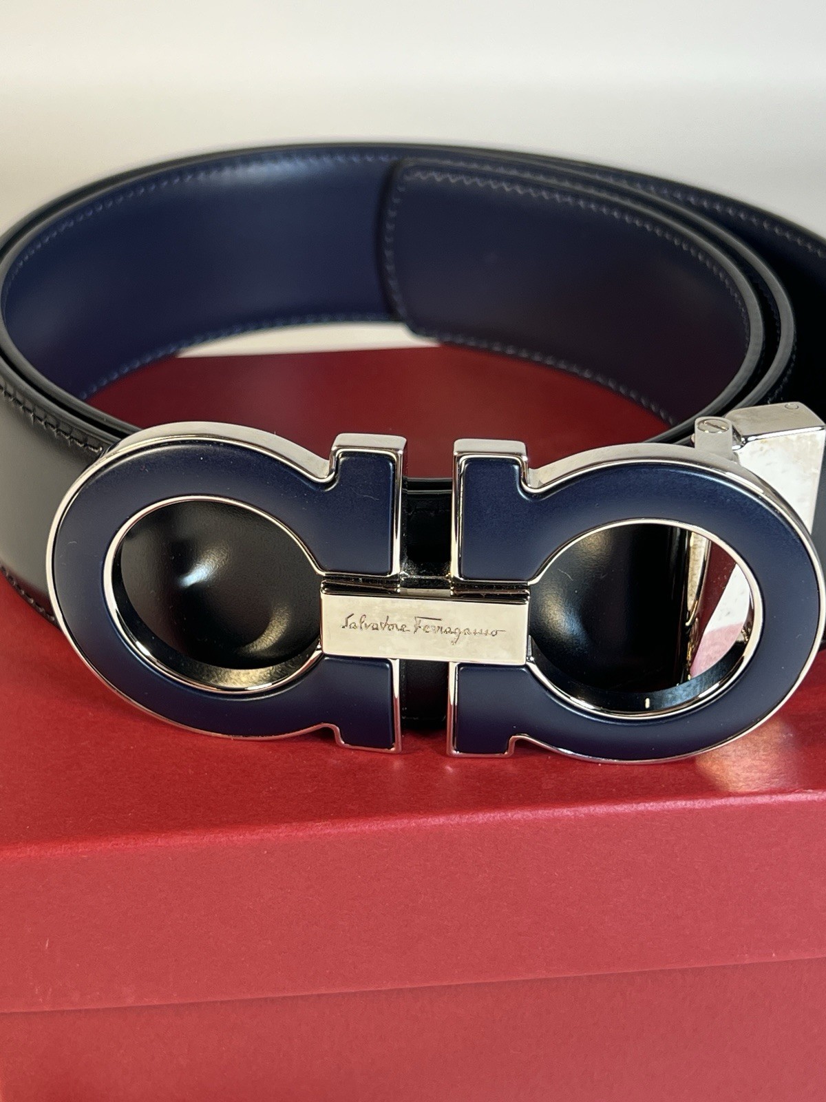 как выглядит Salvatore Ferragamo Gancini Belt Size 39 Black Leather Dark Blue Buckle фото