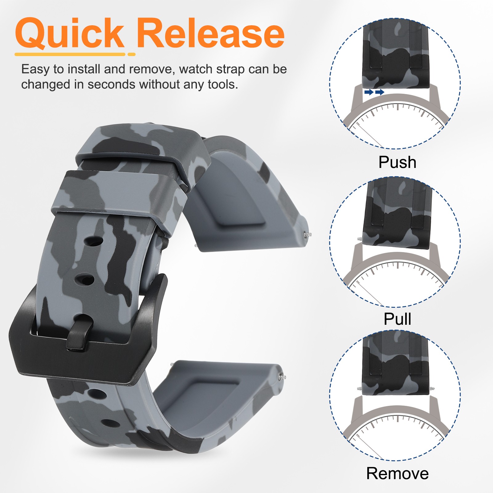 Silicone Watch Bands 24mm Soft Watch Band with Black Buckle, Camo Gray