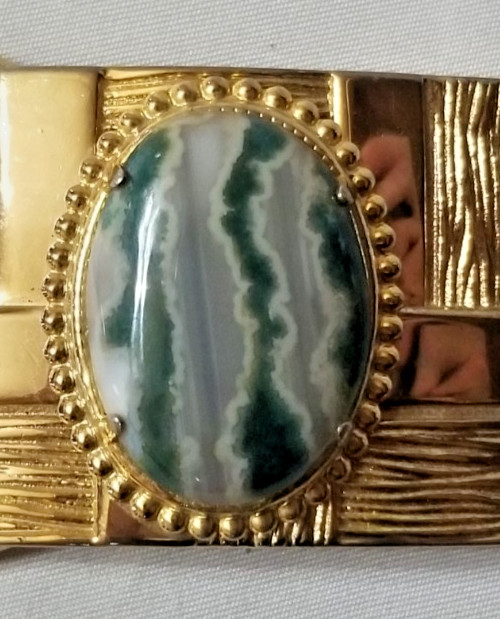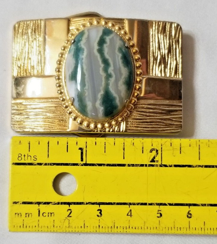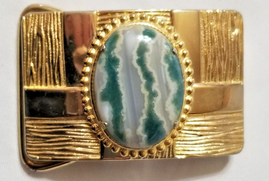 VTG Western Belt Buckle Gold Tone w/ Polished Banded Agate Stone 1.5 Belt