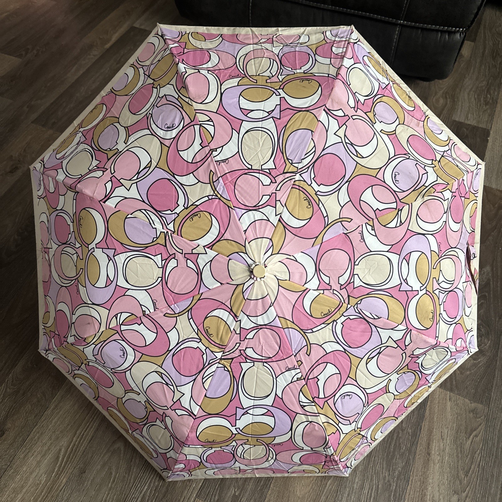 как выглядит Coach Signature Pink Multicolor Optic Folding Umbrella Push Button NWOT фото