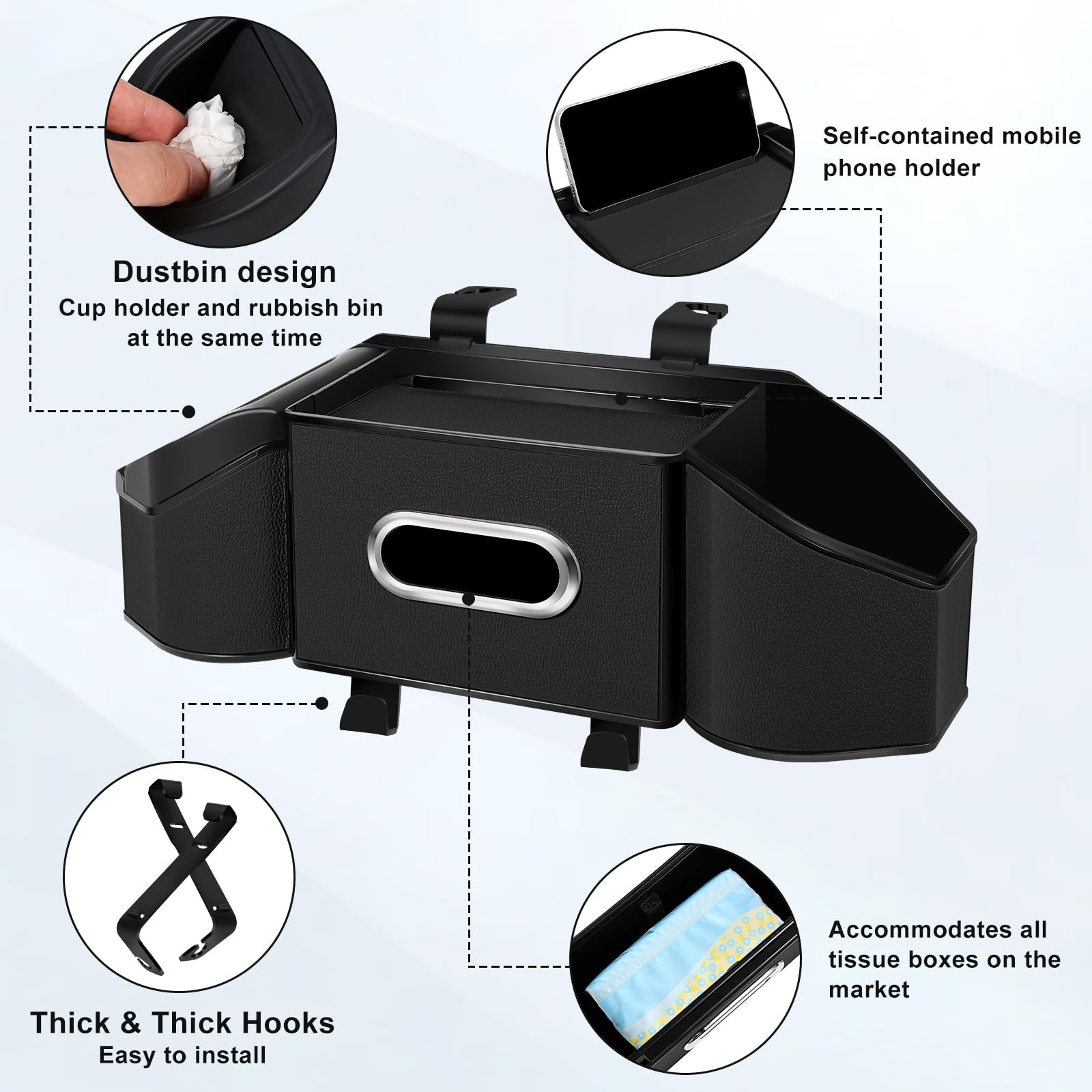Included Components: Cup Holder, Trash Bin, Mobile Phone Holder, Tissue Box, Hooks