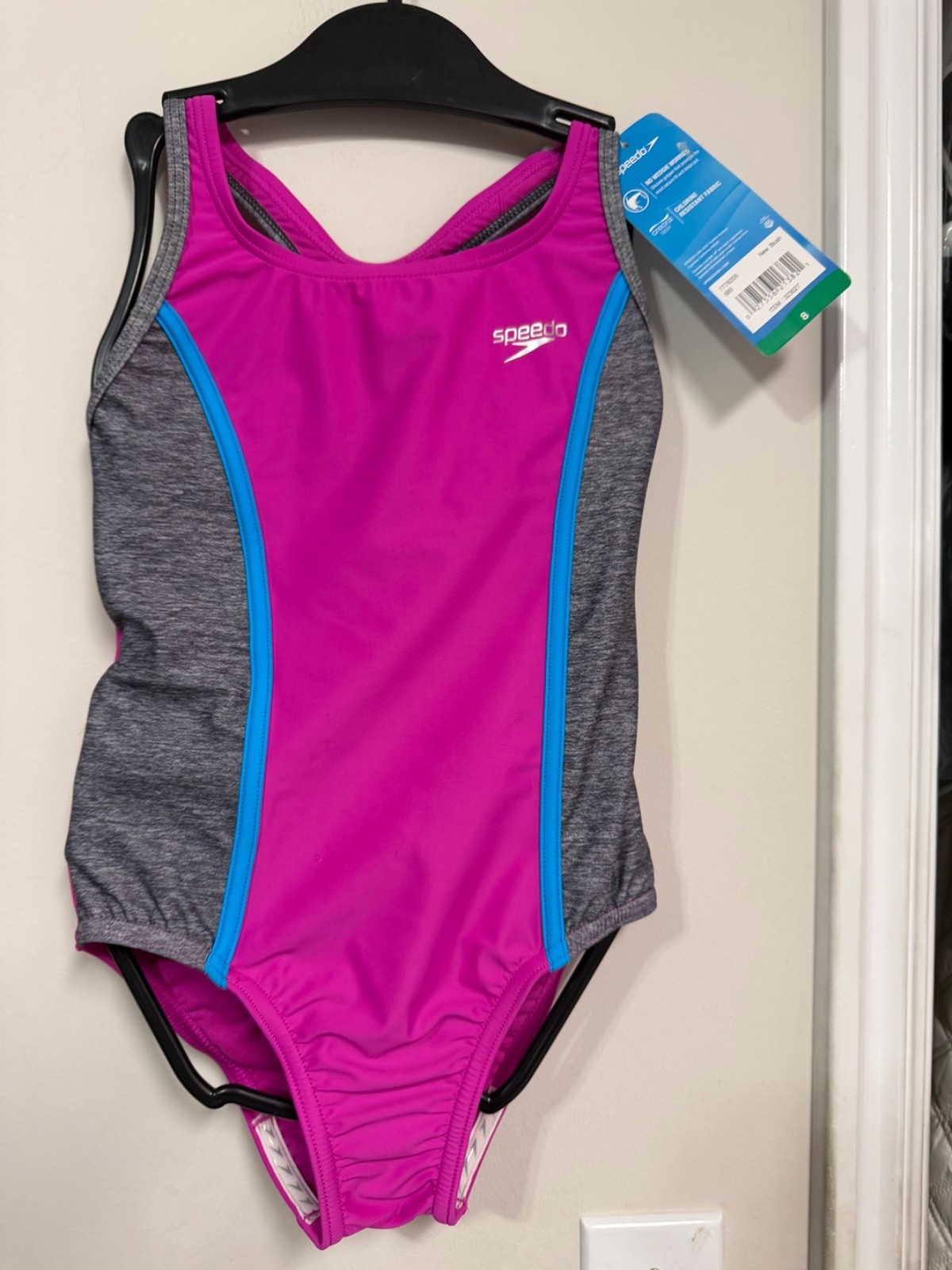 как выглядит New SPEEDO Girls Size 8 Fuchsia Hot Pink Gray Racerback Sport 1 piece Swimsuit фото