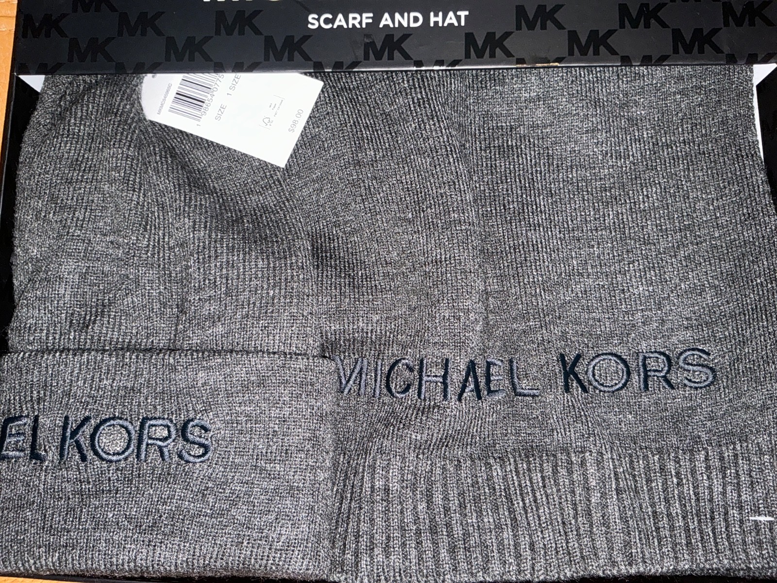 как выглядит MICHAEL KORS charcoal Set LOGO scarf 10 x 60  Hat NWT 98 box фото
