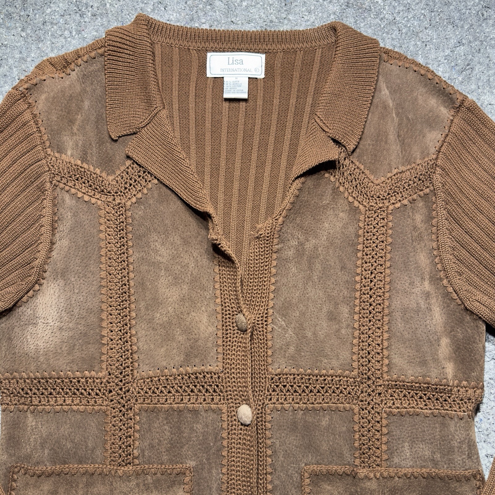 как выглядит Vtg 70 Brown Colored Suede Knit Cardigan Patchwork Sweater Jacket Women Sz M фото