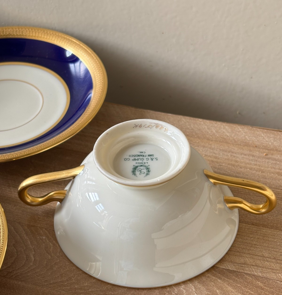 как выглядит Lenox Cobalt Blue Gold 6 Cream Soup Bowls J19K Green Backstamp Gumps фото