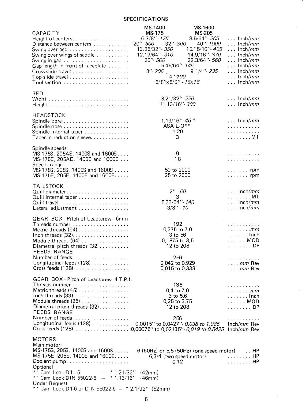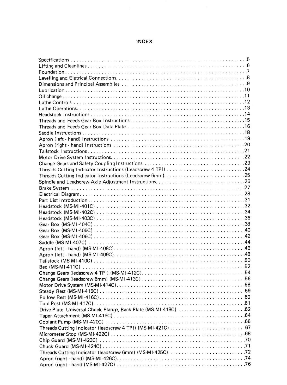 MS-1400 MS-1600 Engine Lathe Operator Parts Manual Fits 1988 Nardini MS175SEMS