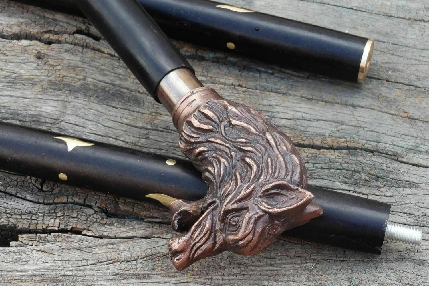 Handmade Walking Stick Wolf Head Antique Brass Handle Wooden Cane Vintage Decor