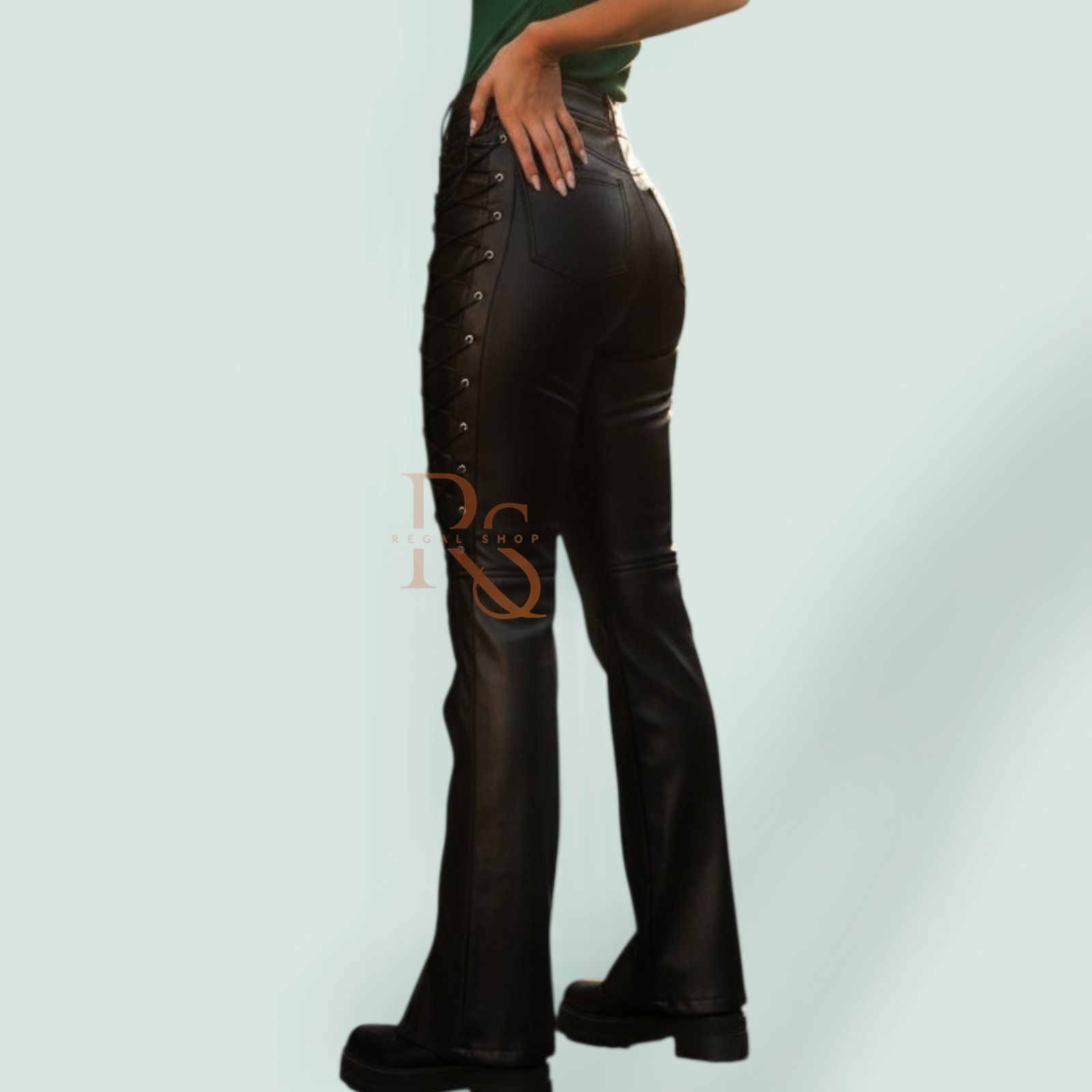 как выглядит Women s Genuine Lambskin Leather Pants High Waist Lace-Up Black Slim Fit Trouser фото