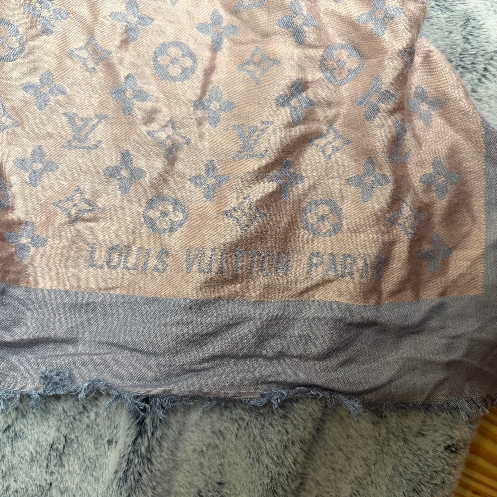 как выглядит Louis Vuitton Paris Monogram Cashmere Silk Scarf Shawl Pink Grey фото