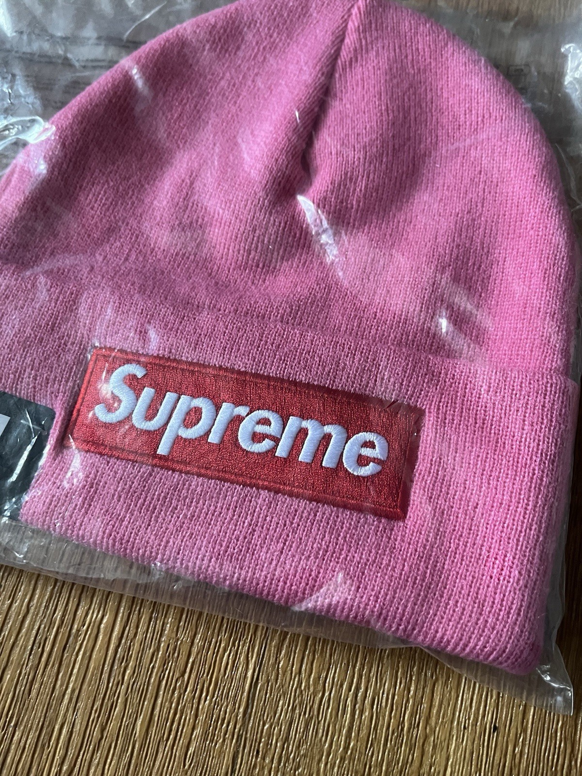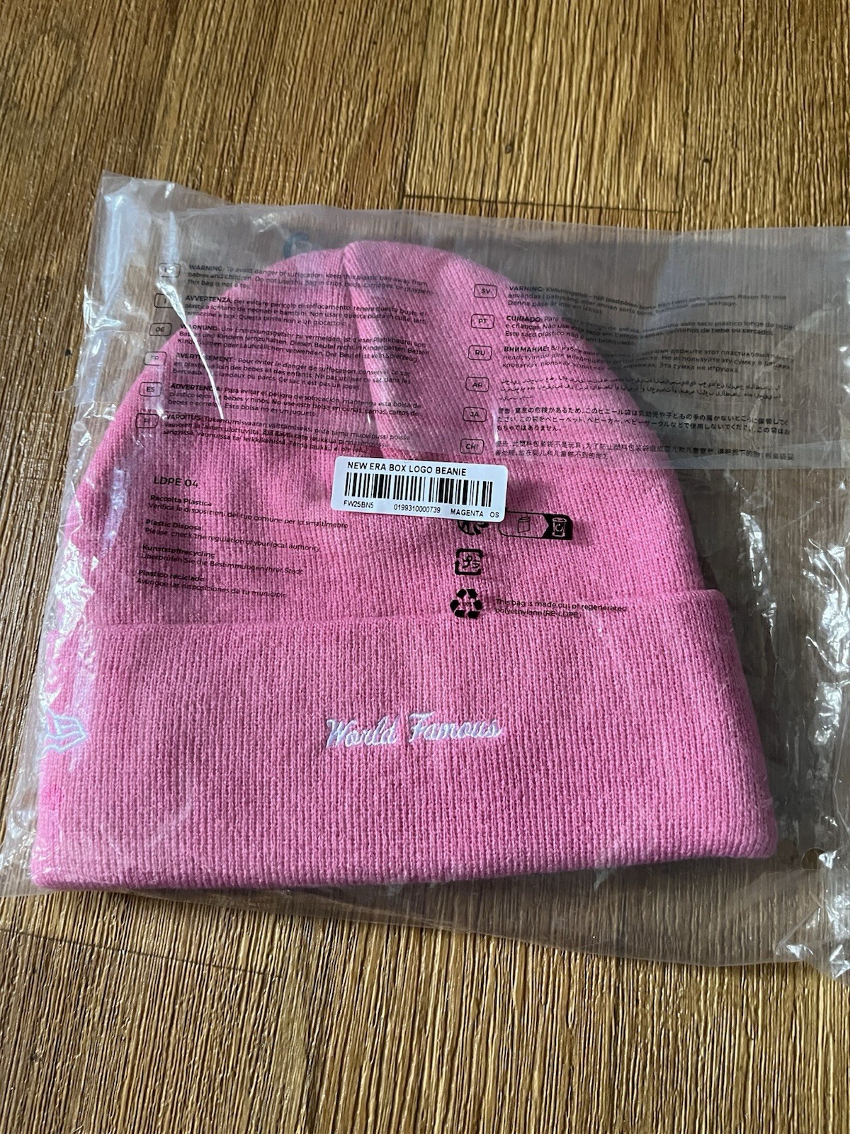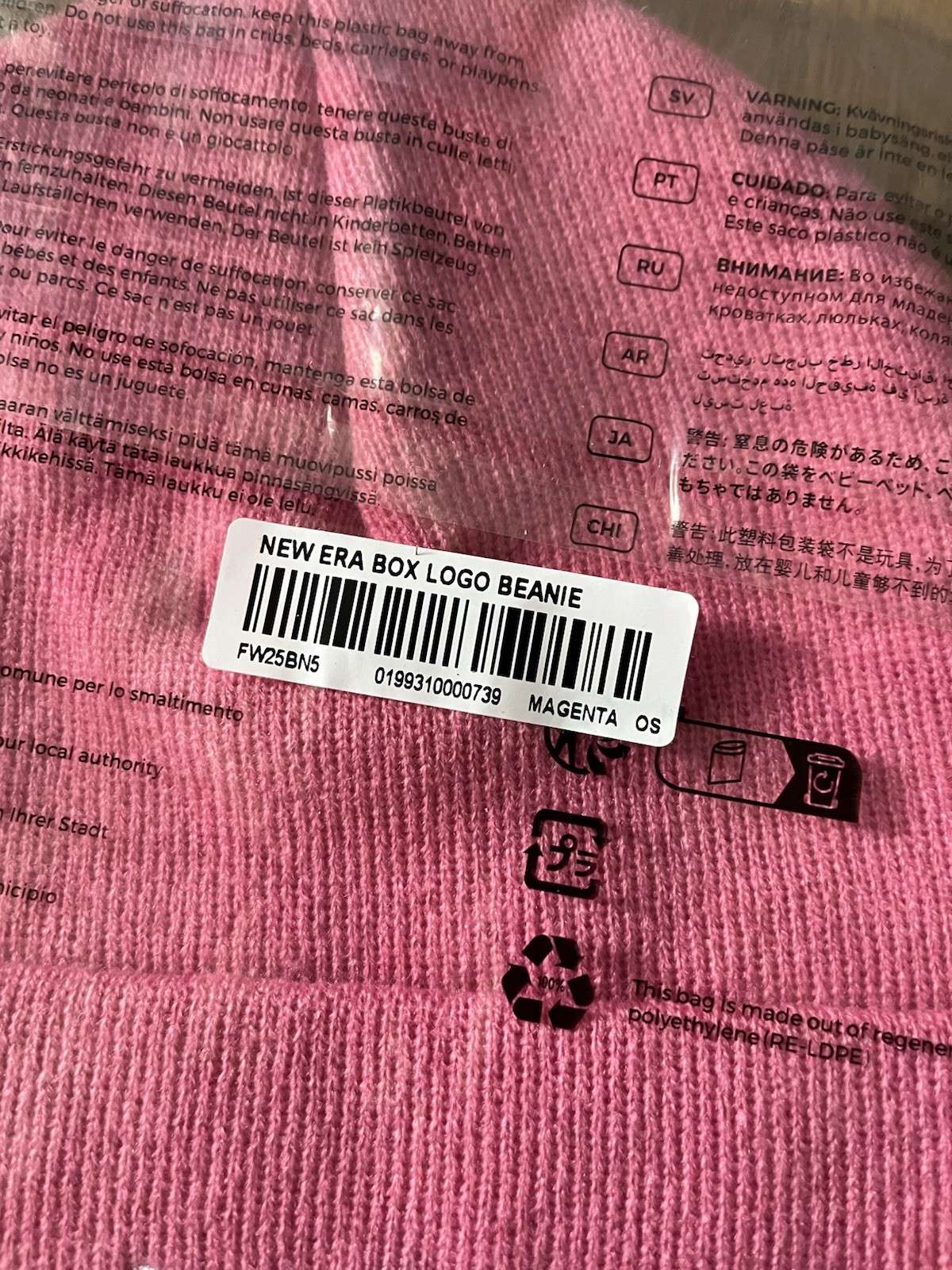 как выглядит New Supreme New Era Box Logo Beanie FW25 Magenta Pink Red Logo In Bag Sealed фото