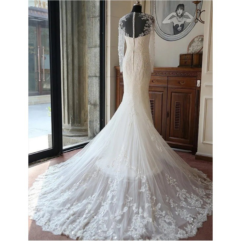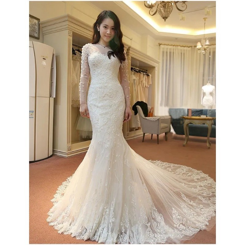как выглядит Luxury Sheer Crew Neck Wedding Dresses Long Sleeves Lace Applique Mermaid Gowns фото