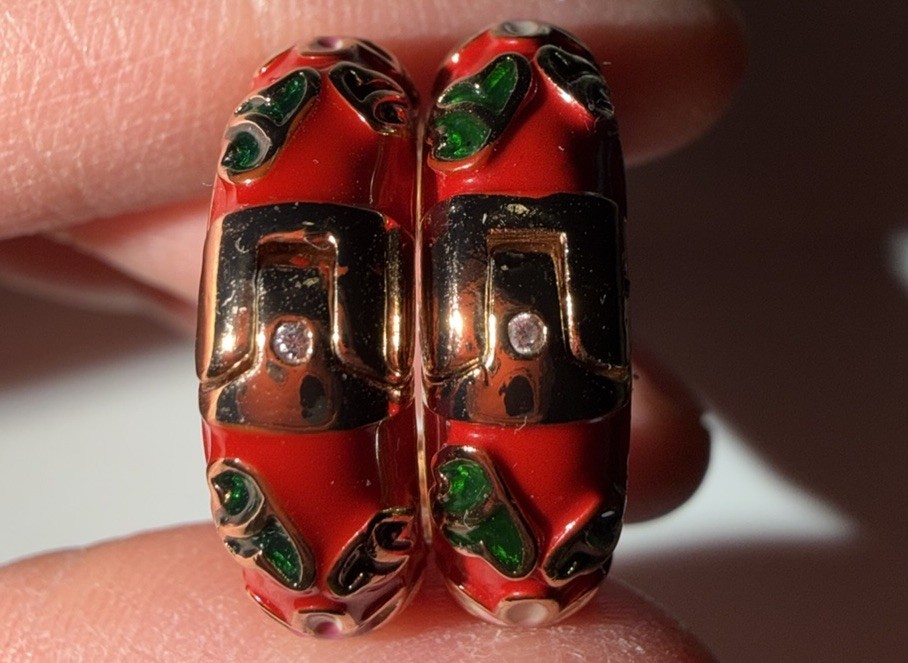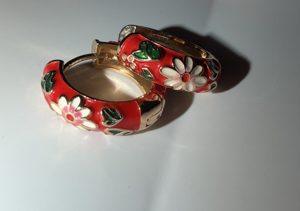 как выглядит Red Enameled Floral Design Hoop Earrings Gold Tone фото