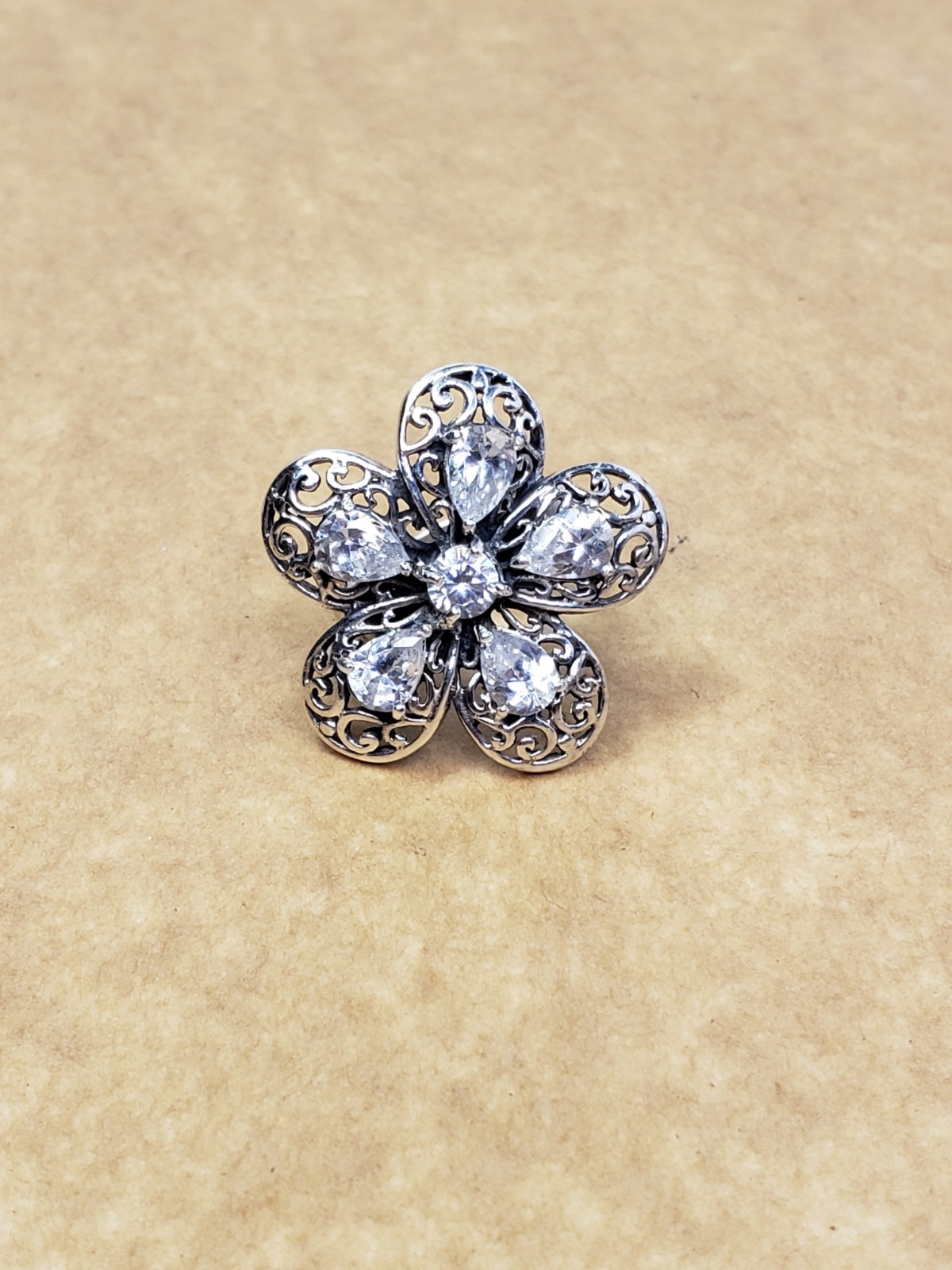 10.5g Sterling Silver Daisy Flower Statement Ring Size 6.5 Cz Clear Crystal