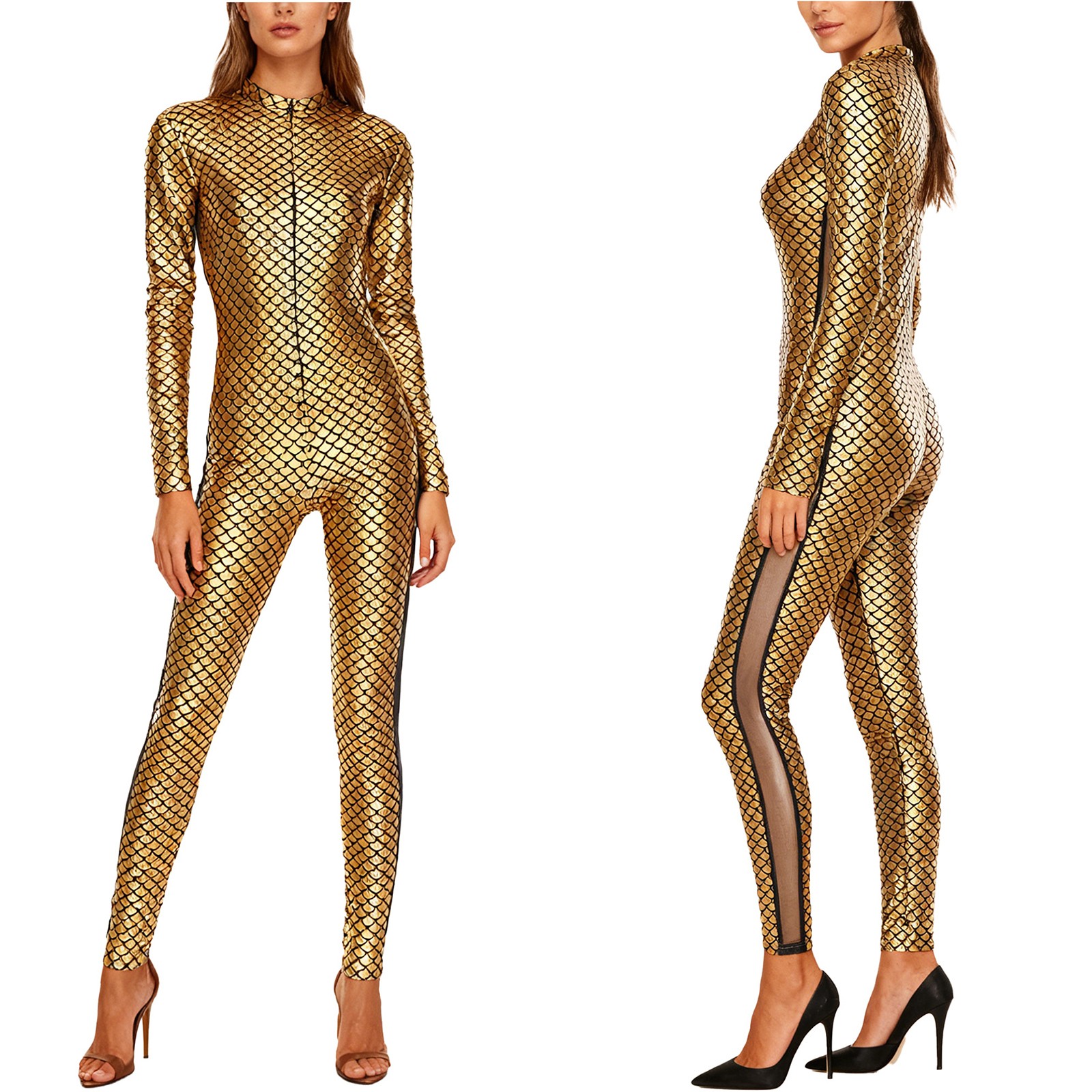 Women Leotards Long Sleeve Jumpsuits Halloween Bodysuit Themed Rompers Metallic