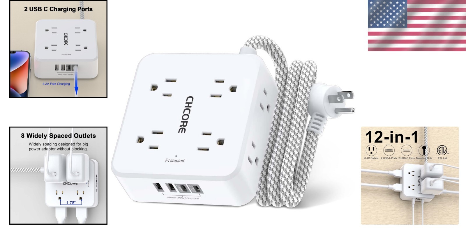 Особенности: On/Off Switch, 8 AC outlets, 4 USB charging ports, 2 USB C ports, 5 Ft braided extension cord, Flat plug, Compact design, Environmental protection, Fire-resistant PC shell, 3-side design, Smart charging technology, Mounting holes, Overload protection